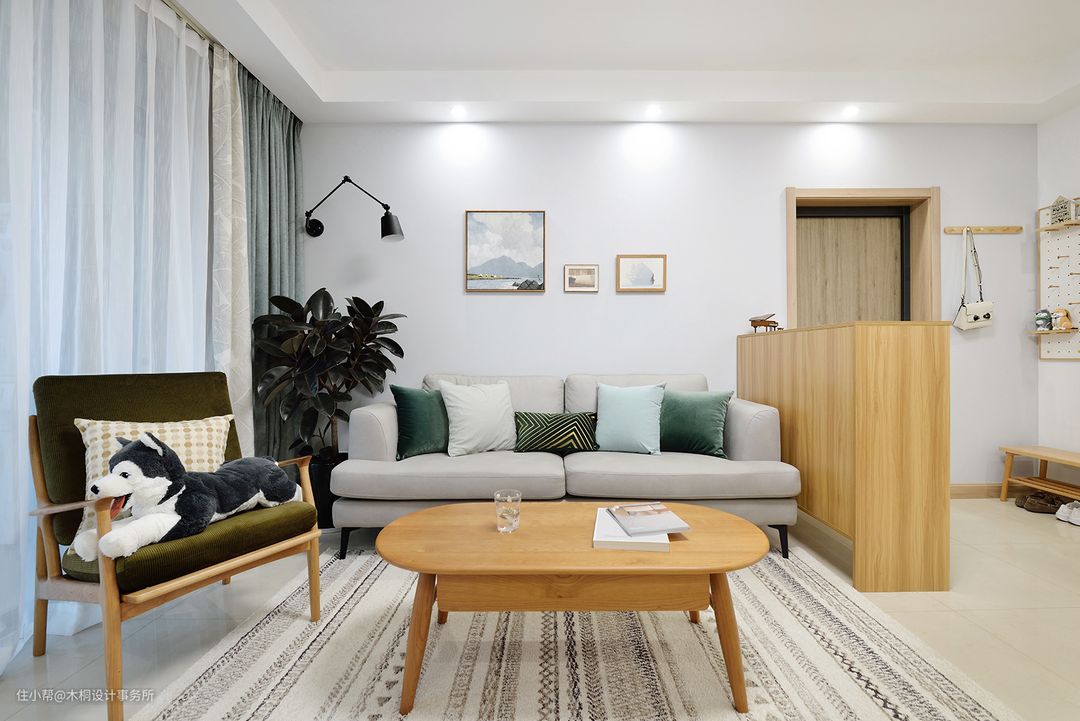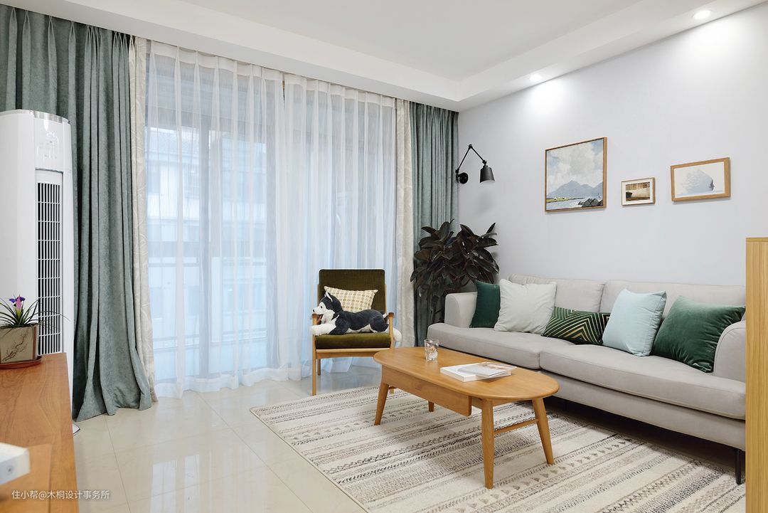 问:装修这套房子最大的难点是什么? 客餐厅地面瓷砖不动,因此在色彩搭配和选择上有一定的局限性,也算是没有尽情发挥吧。 问:如何有效控制装修预算? 像一些成品家具,餐边柜、餐桌、沙发、窗帘,建材部分像灯具、插座、开关、面板都是可以在网上购买的。 问:最满意的设计亮点是什么? 最满意的地方在于餐厅背景板的选择,样式、纹理、颜色和踢脚线以及门板的色彩比较相近,融合感很好。 问:最值得推荐的软装好物有哪些? 网购的窗帘品相还不错,比较值得推荐的是餐厅的餐边柜,挺美的。