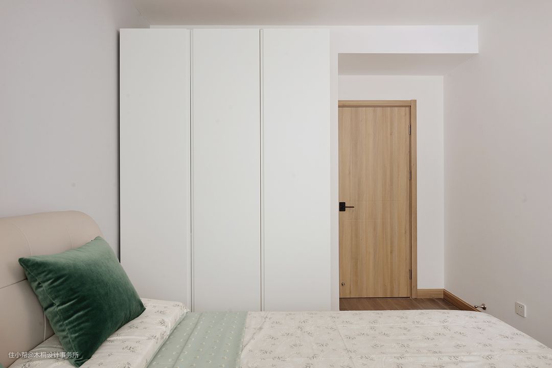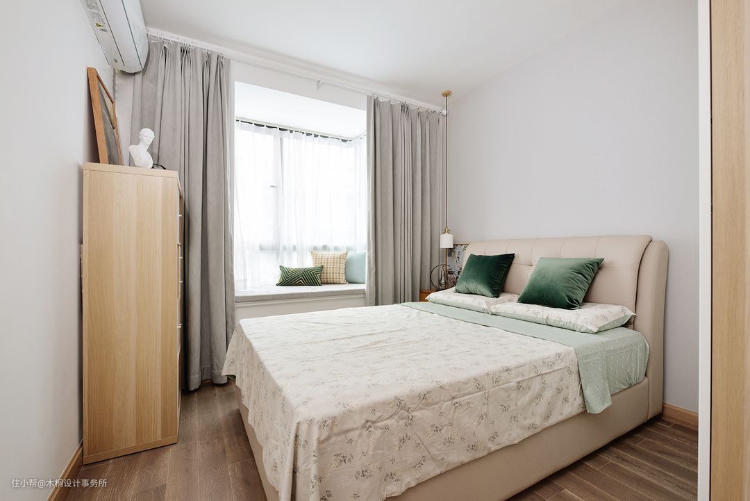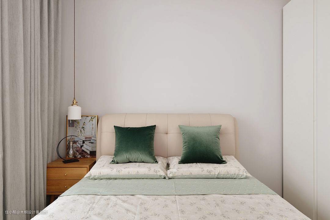 次卧作为后期预备的儿童房,代表中性色的灰色系具有更强的适配性,也给未来的宝宝空间带来后期调整的无限可能。床品样式的选择上采用了碎花元素、辅以中灰色窗帘以及浅灰色乳胶漆(多乐士OONN53000)背景墙,打造柔和、清爽的居室空间。