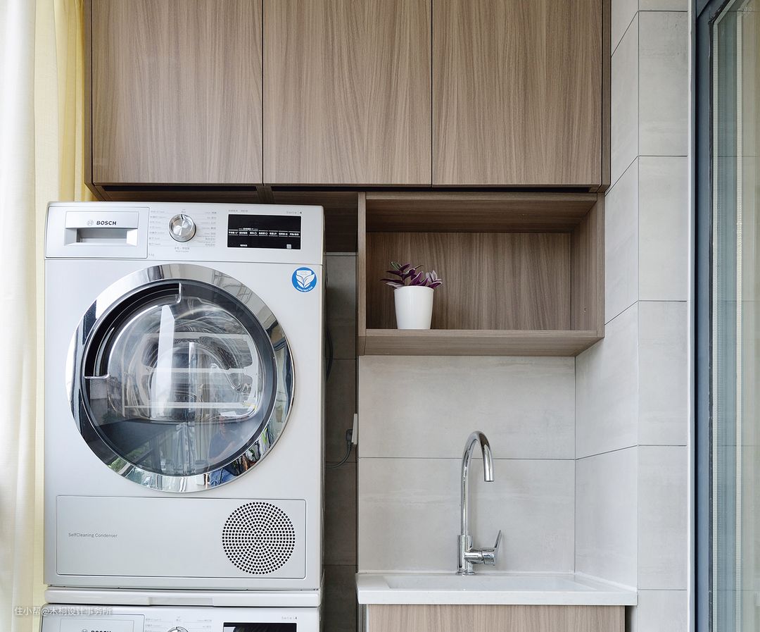 阳台右侧打造洗衣区,洗衣机烘干机竖直叠放,晾晒、风干一步到位;吊柜虽小,但是平时超市日用品囤货来者不拒,轻松容纳。