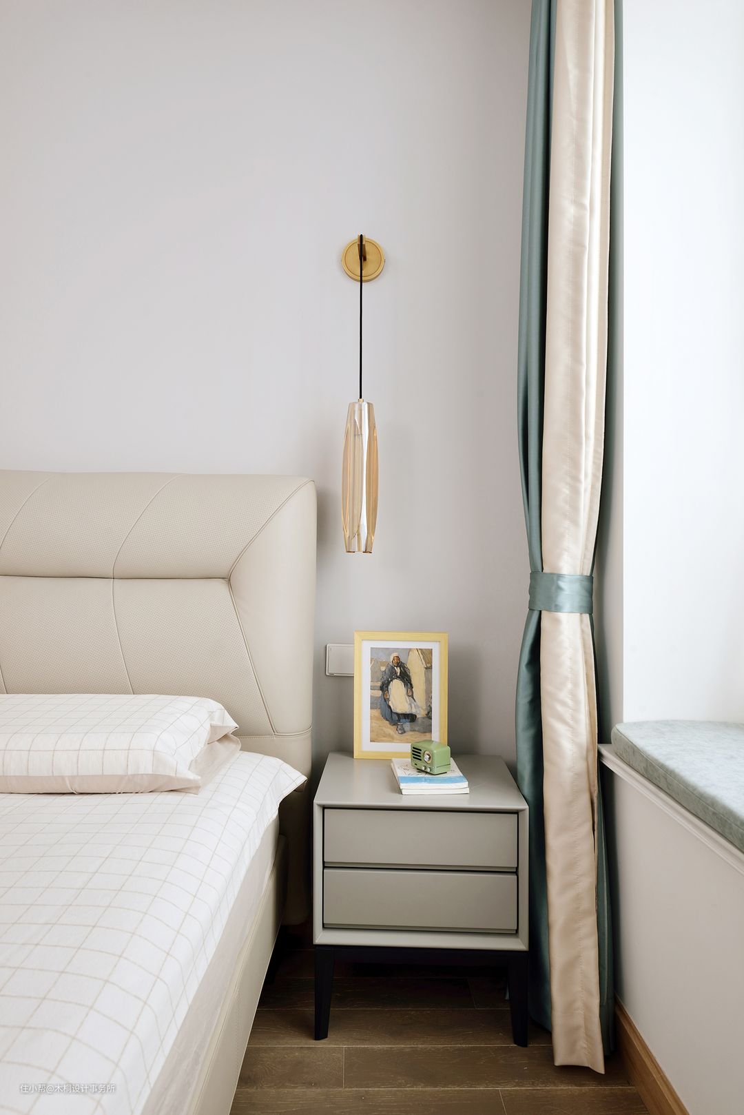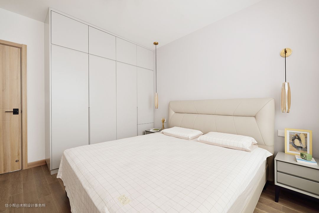 考虑到后期要安置婴儿床的位置,所以在两侧床头灯的选择上采用了吊灯+壁灯结合的方式。把壁灯放在了靠近飘窗的位置,后续在此区域放置婴儿床,可以有效避免吊灯过低、容易磕碰的问题,同时不对称的设计也是一种美。