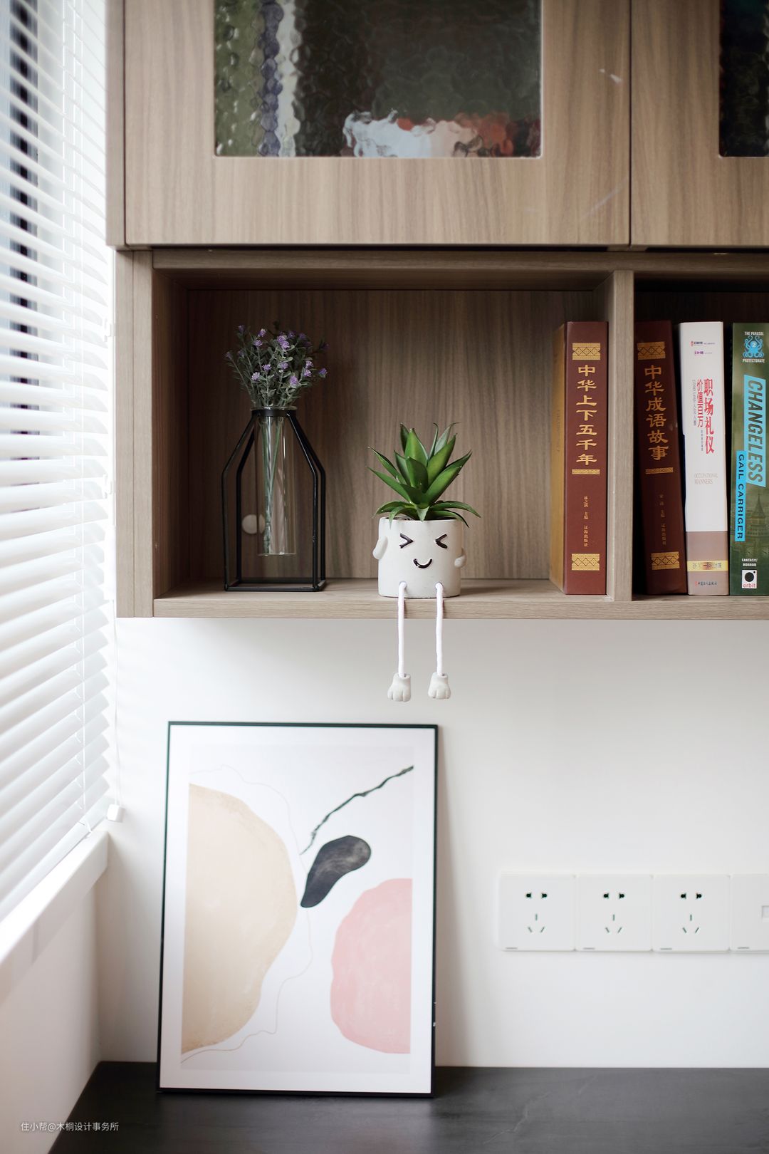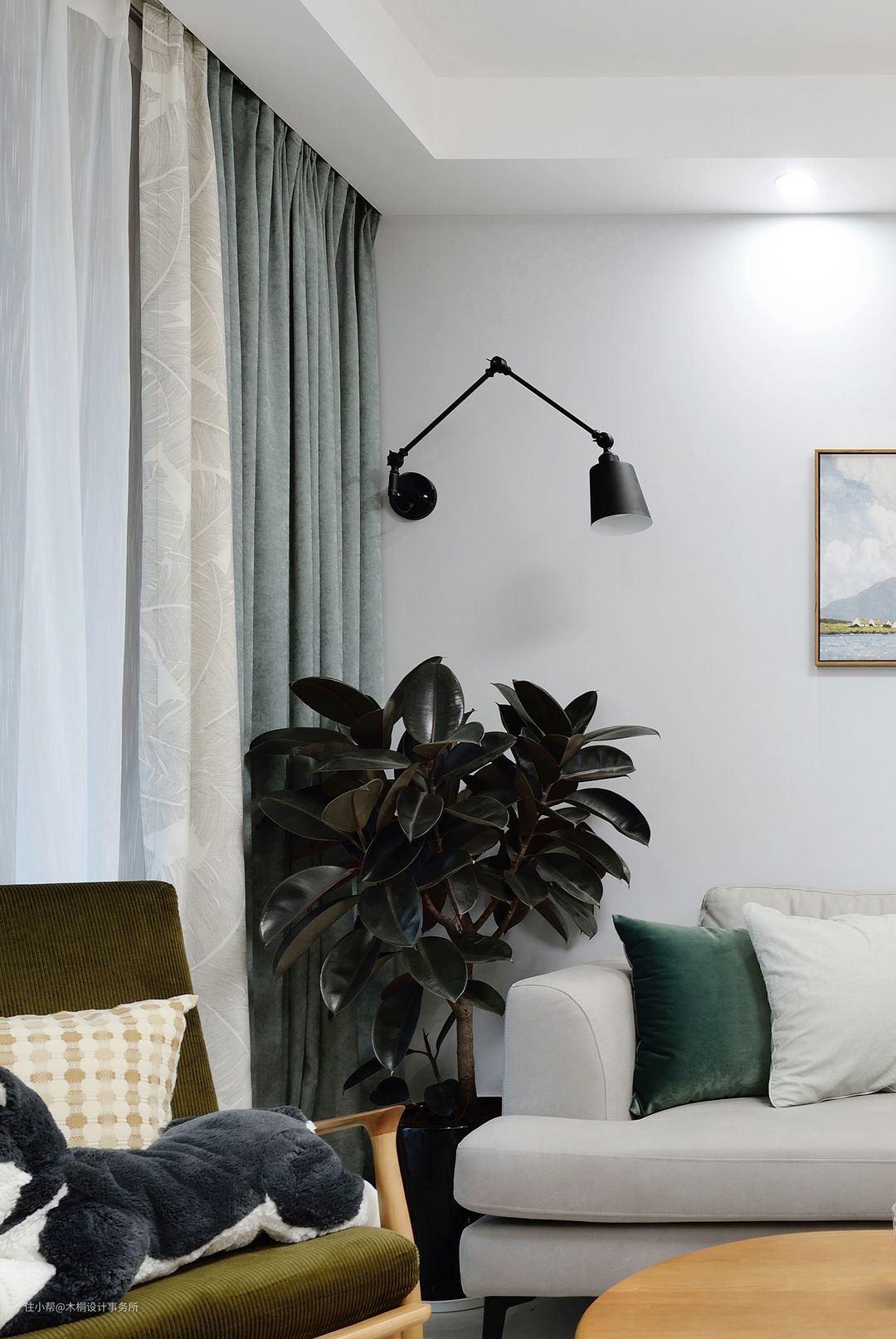 仅有的墙角空间,舍弃原有小巧书架柜,取而代之的是一株生机盎然的印度榕,为空间带来了生气,而且其自身略显厚重的色彩让整体空间色阶更有层次。 附上墙面乳胶漆色号:多乐士62000