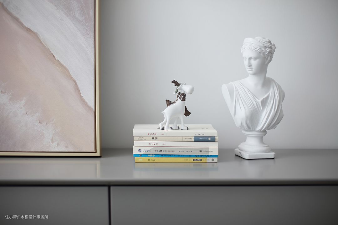 用浅灰色乳胶漆打底,搭配原木色家具,辅以白色木饰面点缀,原木色在灰白两色交相呼应下更显清雅淡然。门框、家具、饰品以及踢脚线利用原木色统一色调,同时通过线性的穿插让空间有序且柔和。