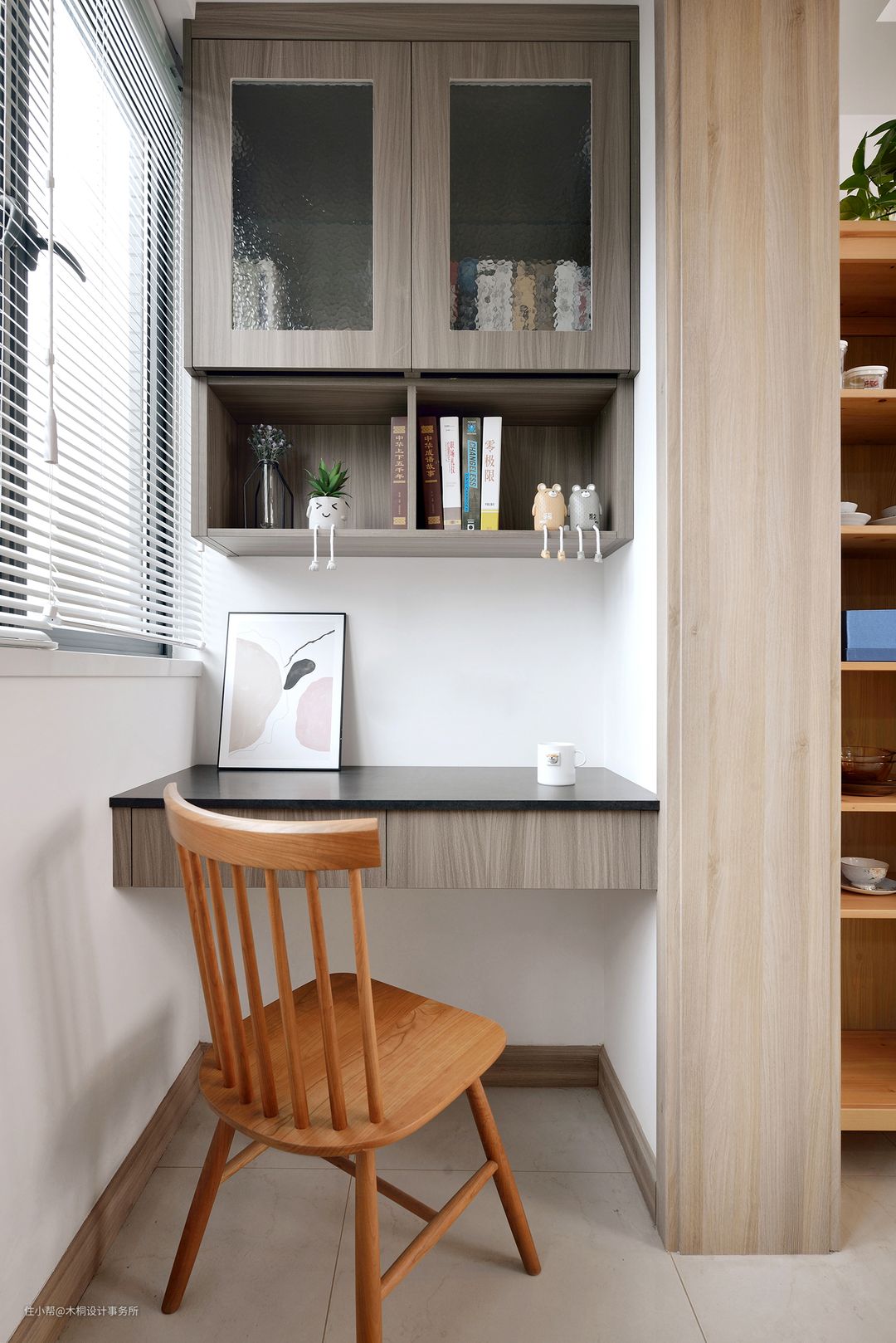 借用原有北阳台富余的空间设置一个工作区,同时在材质上,选择了色度相对较低的中灰色木纹饰面,通过材质的改变以及色彩运用进行空间的划分,使其偏于一角而又独立于喧嚣之外,休闲与工作合二为一。悬空的书桌设计,简约轻便的同时也可保证底部无卫生死角。