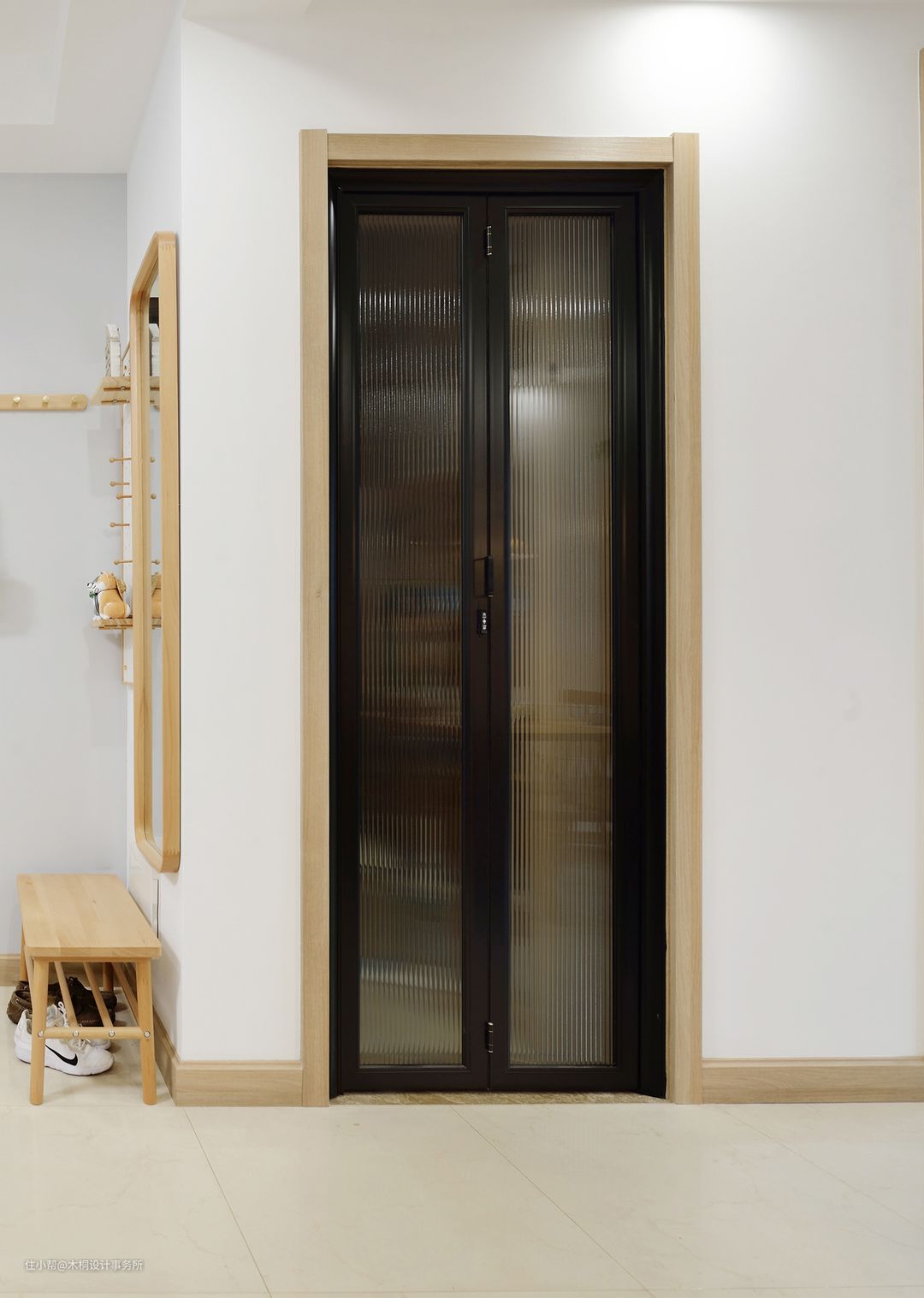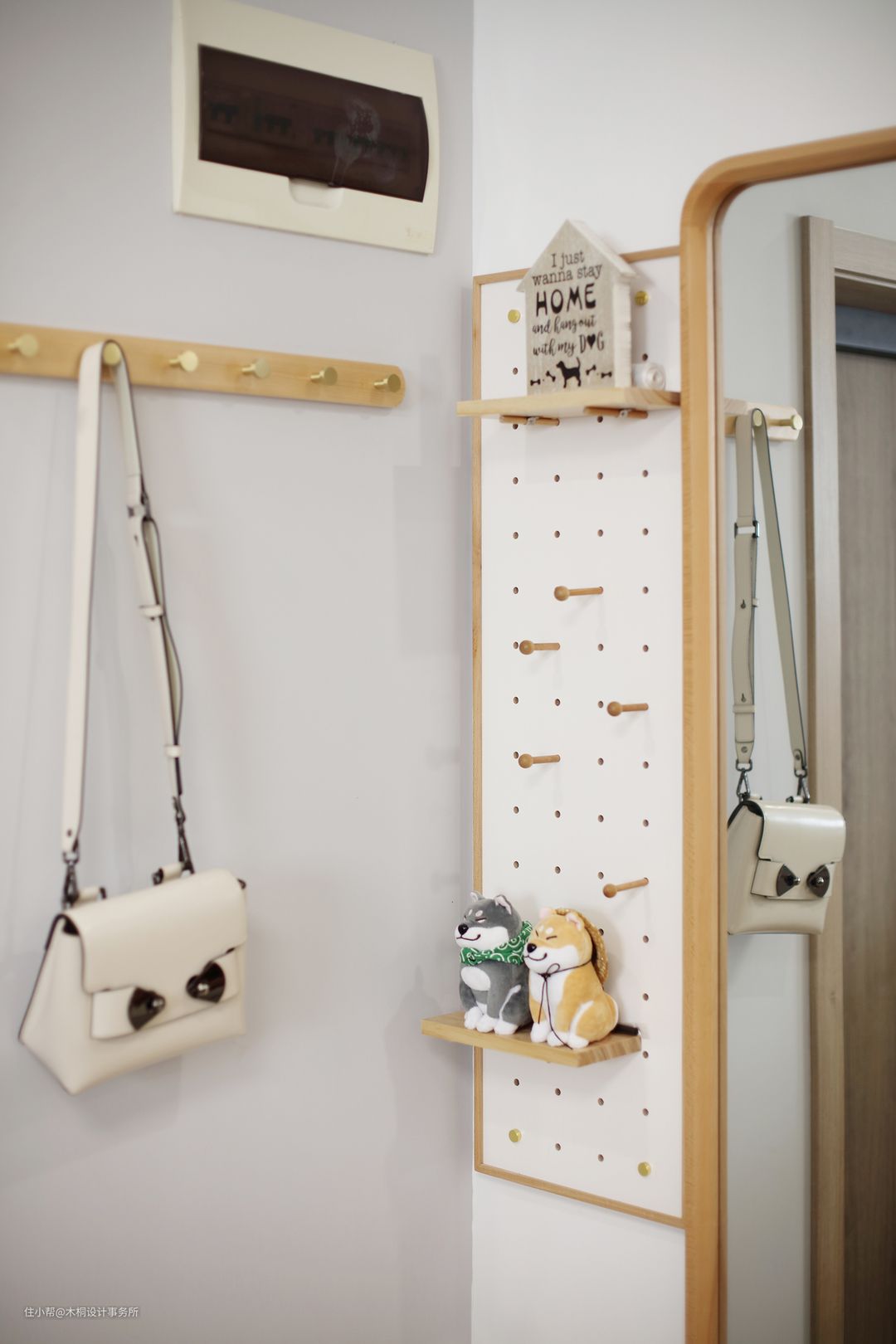 玄关另一侧以实用角度出发,充分利用转角墙面空间,分别设置了洞洞板、全身镜和衣帽钩。出门前的衣着整理,进门后的钥匙、包包、围巾、外套等轻松放置。