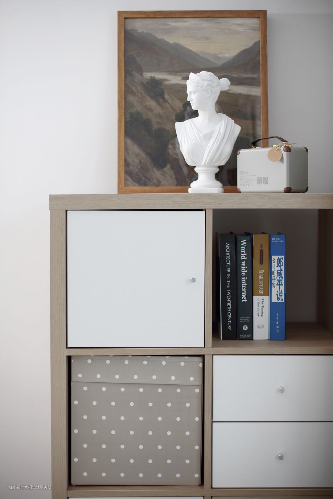 设计时考虑到入户空间视觉通透性的问题,选择的是半高的鞋柜,整体尺寸是1300*1100*400mm(哈哈,平放的收纳习惯搭配上一双篮球运动员的脚码,不加宽不行呀)。鞋柜上层两个抽屉,中部三层鞋子收纳区,下部镂空设计,逐层收纳,安放有序。在满足日常需求的同时,也有效保证客厅区域的隐私性。
