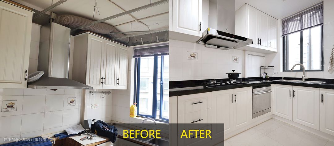 原有厨房的基础设施保存良好,因此在此区域以局部调整的形式对功能性和色调进行升级。 1、出于实用性考虑,橱柜台面由原有的纯天然大理石材质更换为结构严密、抗污能力极强、易擦洗的黑色石英石; 2、把易发黄的PVC吊顶更换为抗油污的铝扣板吊顶; 3、增加烤箱,根据烤箱尺寸,针对转角位置的柜门板开口,嵌入式放置。