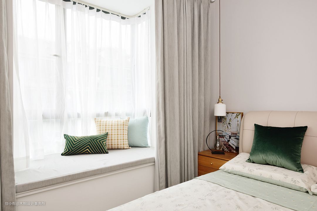 飘窗无法敲除,所以直接定制5cm的乳胶坐垫,瞬间拥有家居休闲角。