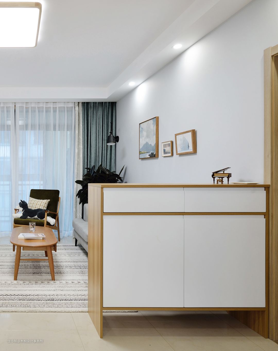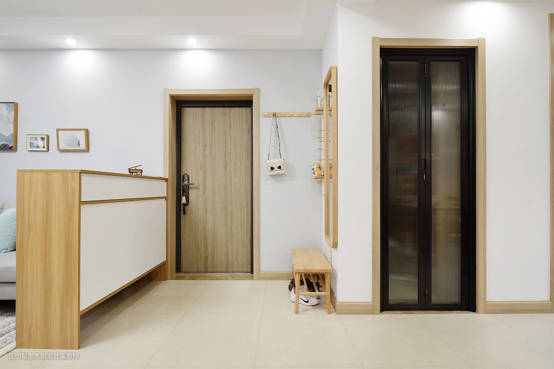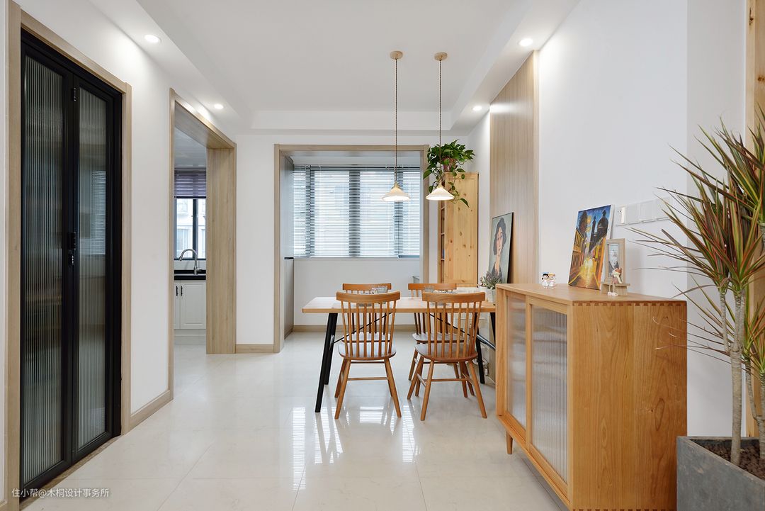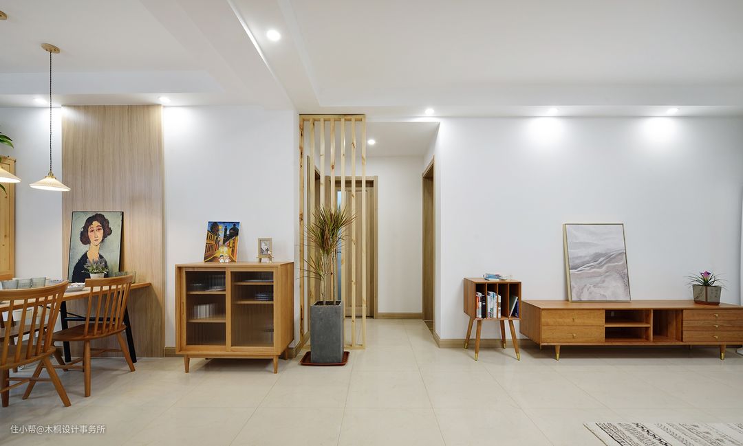 针对入户门正对卫生间门的问题,在卫生间门口增加小隔断。整体采用30*80mm的杉木木方,通过对基层的防腐加工,使上海的“黄梅季”不再是威胁,同时杉木材质也与餐厅置物柜的形成一定的统一性。高度通顶(2400mm),整体更加协调统一;一株“三色千年木”以点破面,更添生气。