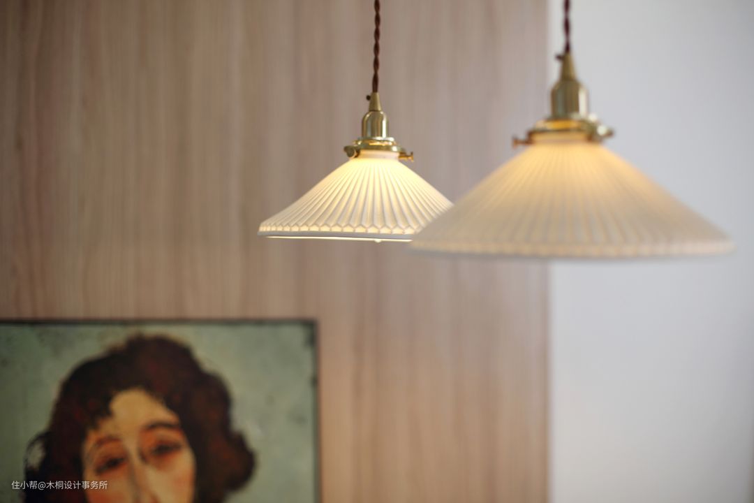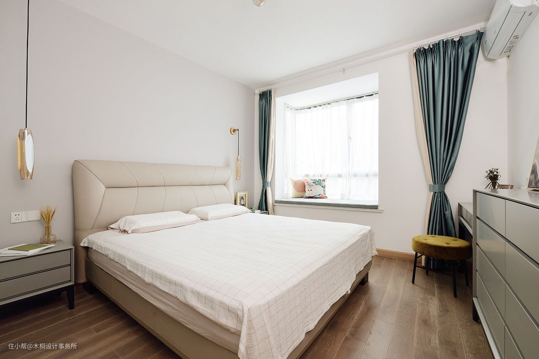 考虑到后期要安置婴儿床的位置,所以在两侧床头灯的选择上采用了吊灯+壁灯结合的方式。把壁灯放在了靠近飘窗的位置,后续在此区域放置婴儿床,可以有效避免吊灯过低、容易磕碰的问题,同时不对称的设计也是一种美。