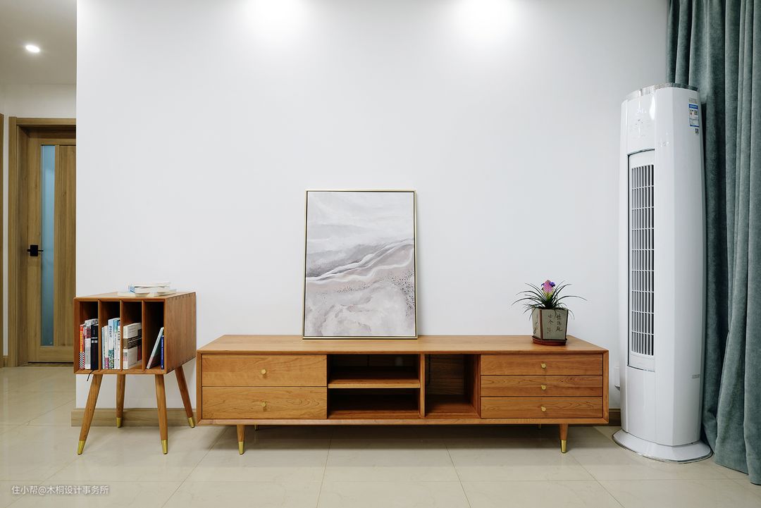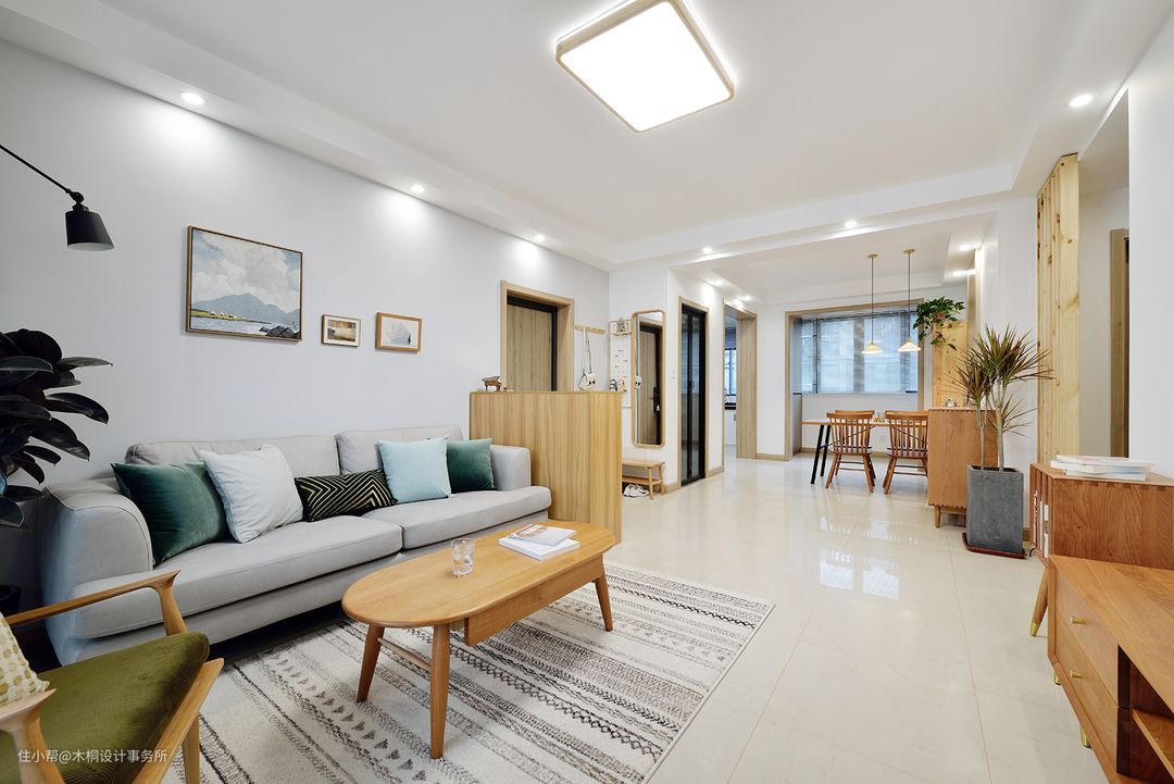 用浅灰色乳胶漆打底,搭配原木色家具,辅以白色木饰面点缀,原木色在灰白两色交相呼应下更显清雅淡然。门框、家具、饰品以及踢脚线利用原木色统一色调,同时通过线性的穿插让空间有序且柔和。