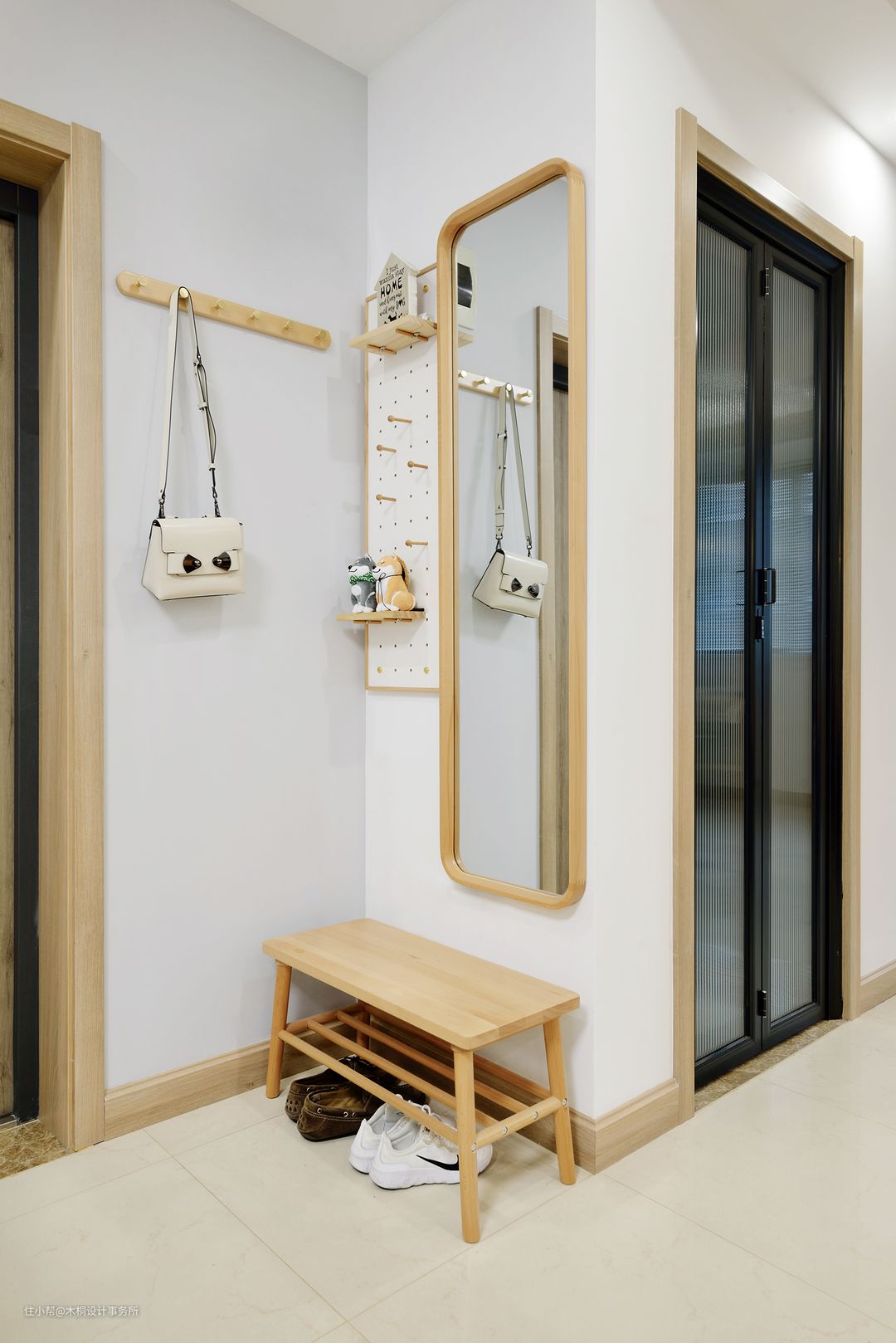 玄关另一侧以实用角度出发,充分利用转角墙面空间,分别设置了洞洞板、全身镜和衣帽钩。出门前的衣着整理,进门后的钥匙、包包、围巾、外套等轻松放置。