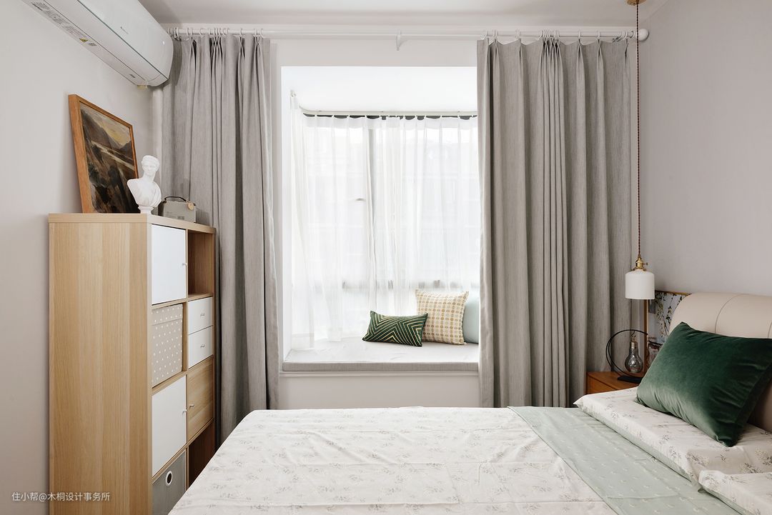 次卧作为后期预备的儿童房,代表中性色的灰色系具有更强的适配性,也给未来的宝宝空间带来后期调整的无限可能。床品样式的选择上采用了碎花元素、辅以中灰色窗帘以及浅灰色乳胶漆(多乐士OONN53000)背景墙,打造柔和、清爽的居室空间。