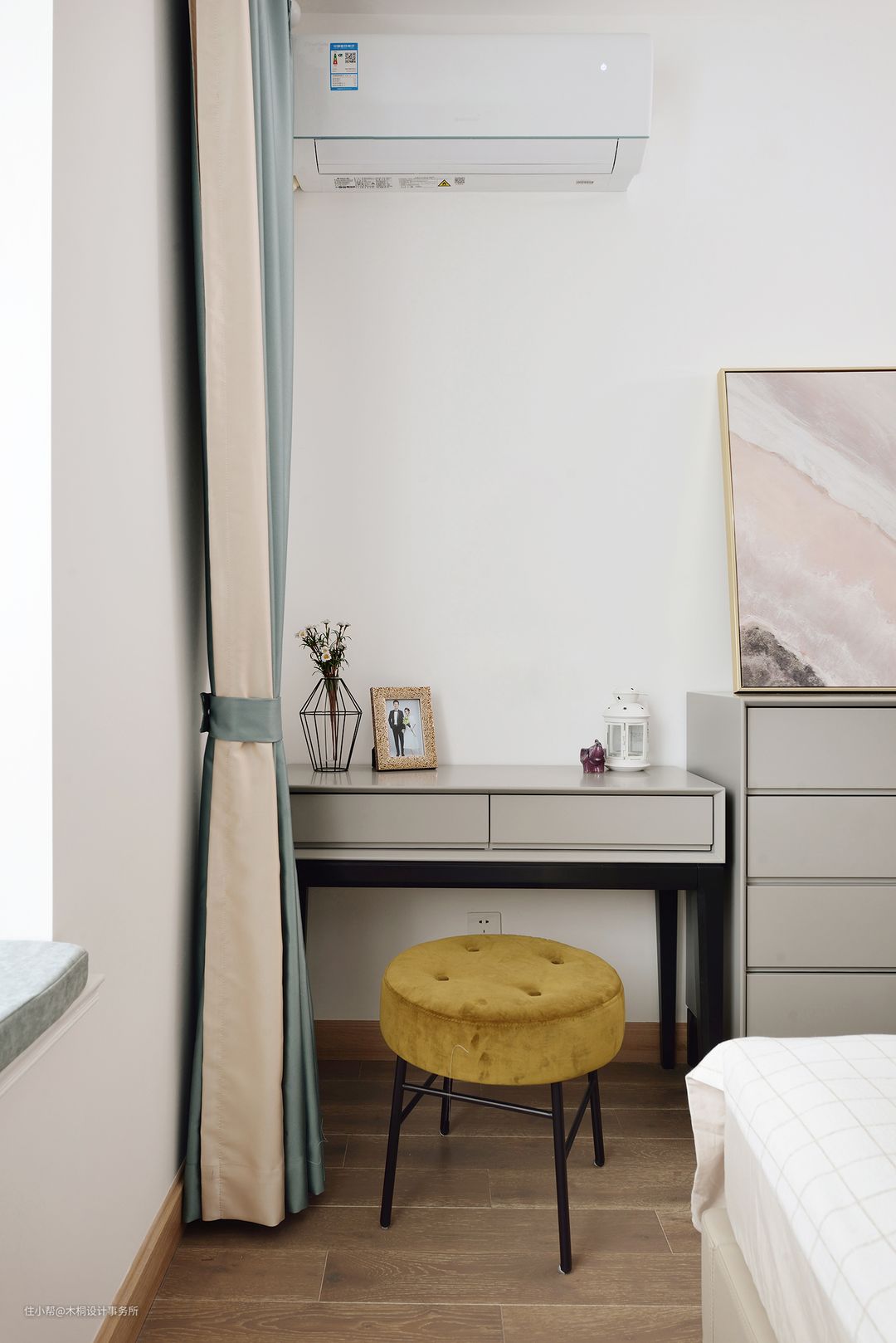 床对面区域放置CP二人组(八斗柜+化妆桌),满足梳妆和日常收纳。
