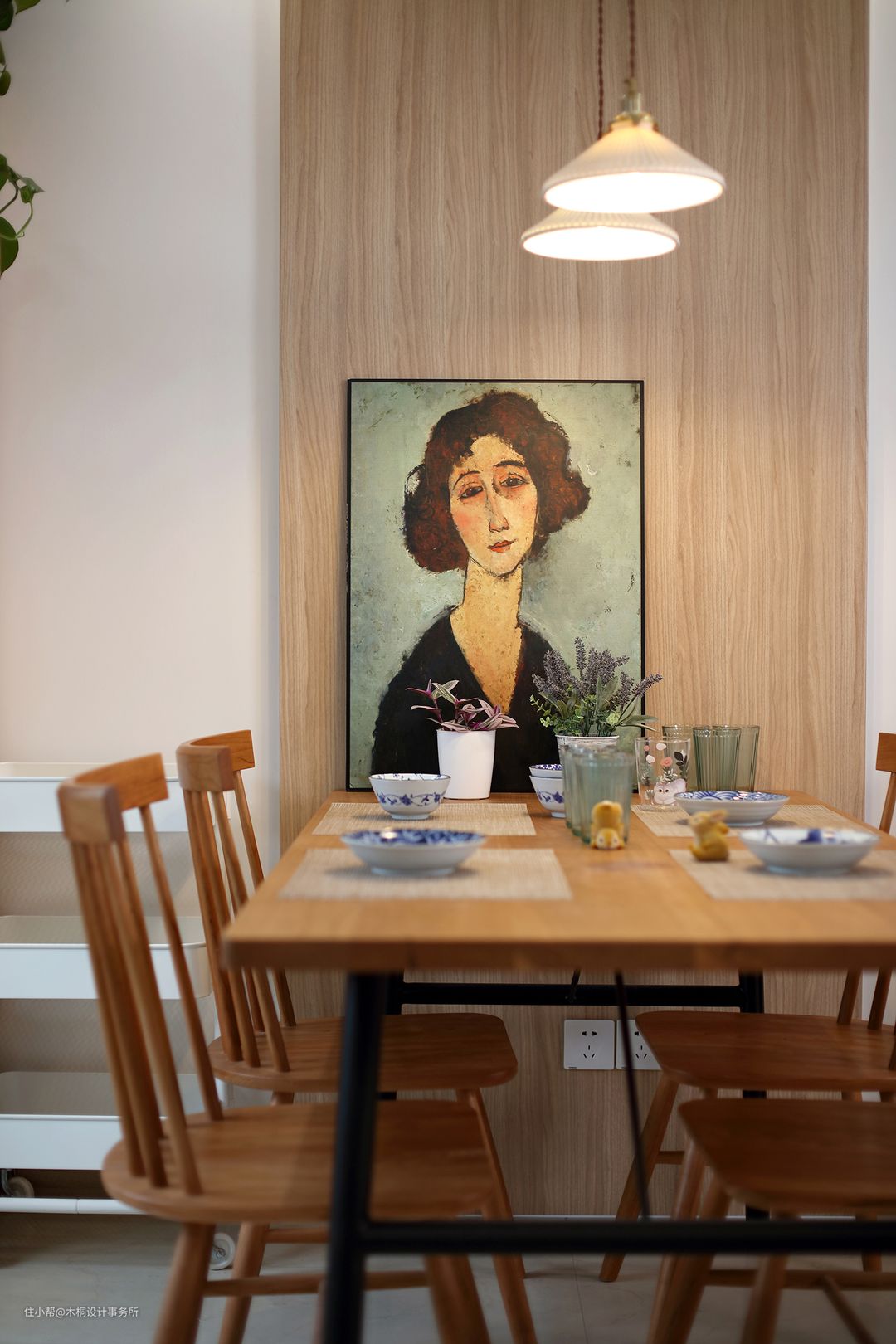 餐厅区域作为屋主最意想不到也是最钟意的空间,简约、实用、温馨是本区域设计的核心。为了最大化的保证上墙木饰面板与其他木质家具的统一性(色彩、纹理),设计师特意跑了一趟制作工厂,现场确认木饰面表面的纹理属性,筛选其适合的色彩饱和度以及判定木饰面表皮的木节规律,确保能够与踢脚线以及门套的色度相合且统一。