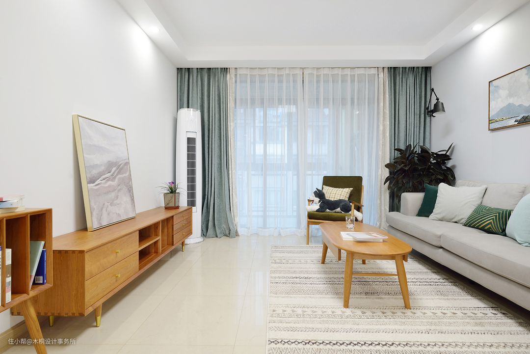 客厅作为家庭社交中较为重要的空间区域,温馨且自然还是很有必要的。因此在色彩搭配上以白色和浅灰为主色调,樱桃木色(茶几、电视柜、边几)、墨绿色(抱枕)、烟灰蓝(窗帘)点缀,打造温馨、自然、明亮的客厅空间。