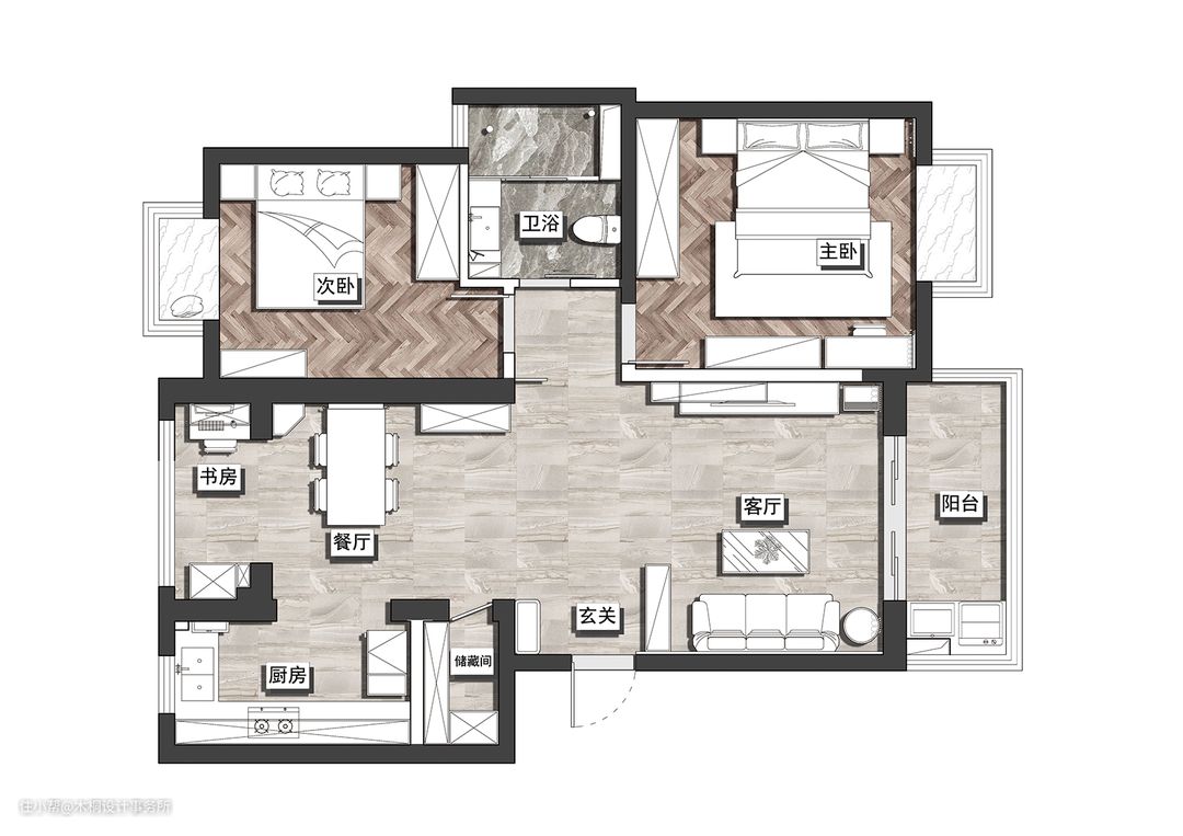 借用原有北阳台富余的空间设置一个工作区,同时在材质上,选择了色度相对较低的中灰色木纹饰面,通过材质的改变以及色彩运用进行空间的划分,使其偏于一角而又独立于喧嚣之外,休闲与工作合二为一。悬空的书桌设计,简约轻便的同时也可保证底部无卫生死角。