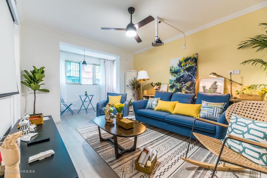 客厅整体做的非常休闲,暖黄色的墙面和充满生机的绿植再搭配上编织的摇椅,让人在进入的一瞬间感觉来度假一般