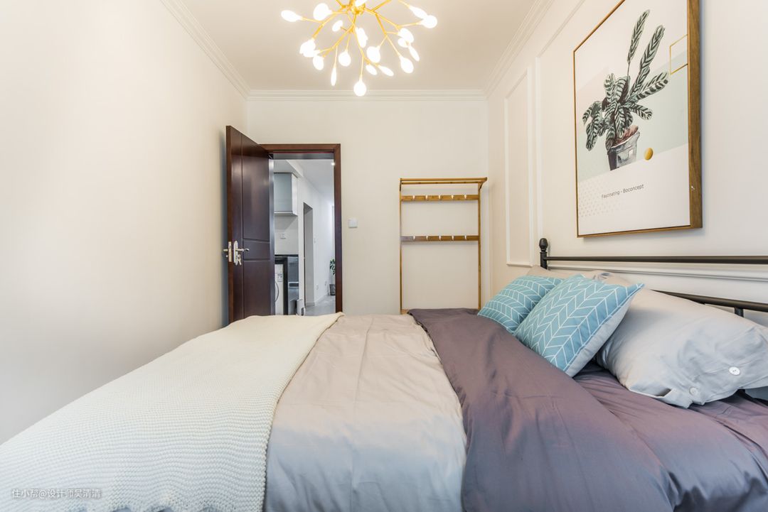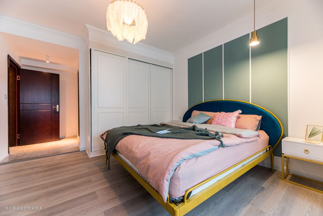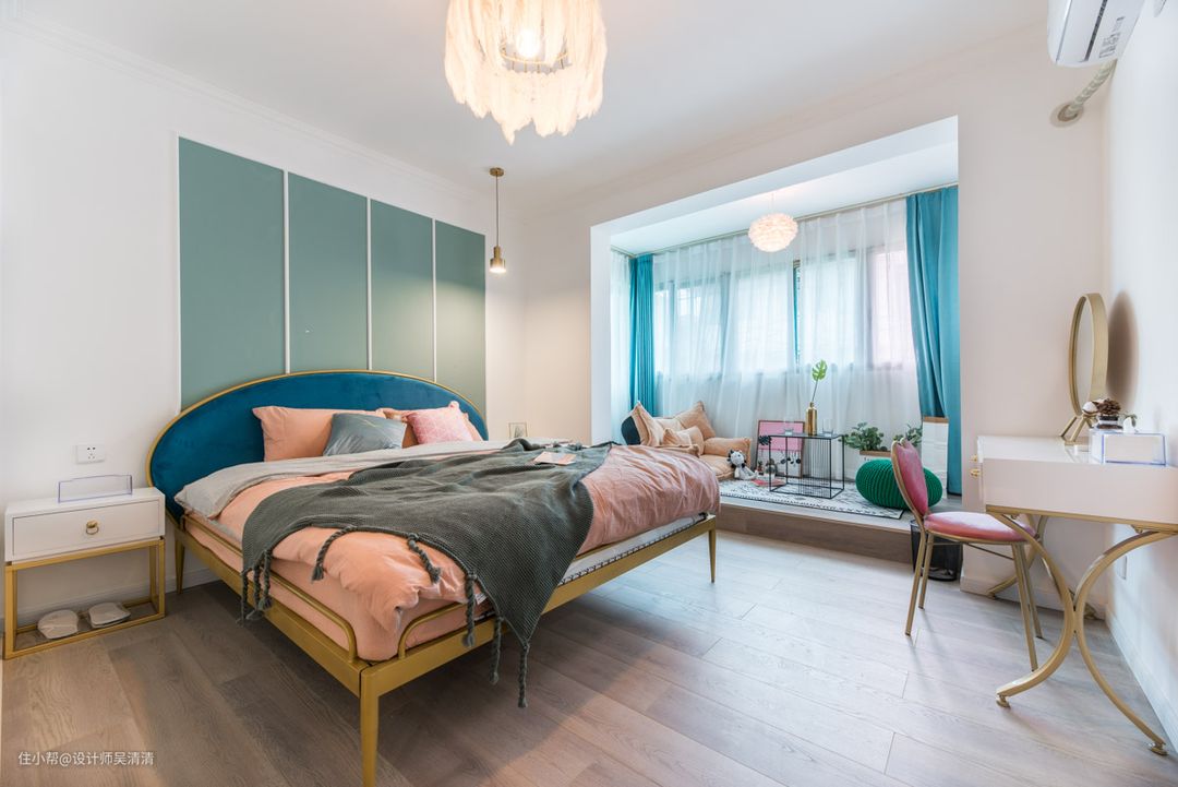 主卧整体的感觉还是北欧风格为主,但是家具都选择了偏向于轻奢风的金属色,阳台处为了利用起来做了抬高,这样一来上面放上懒人沙发小茶几非常适合看看书之类的一个小休闲区域