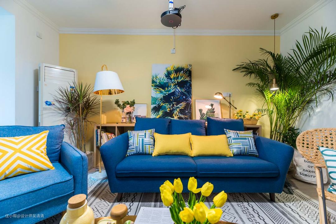 客厅整体做的非常休闲,暖黄色的墙面和充满生机的绿植再搭配上编织的摇椅,让人在进入的一瞬间感觉来度假一般