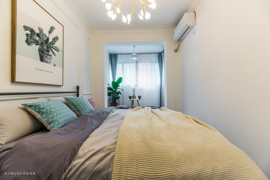 主卧整体的感觉还是北欧风格为主,但是家具都选择了偏向于轻奢风的金属色,阳台处为了利用起来做了抬高,这样一来上面放上懒人沙发小茶几非常适合看看书之类的一个小休闲区域