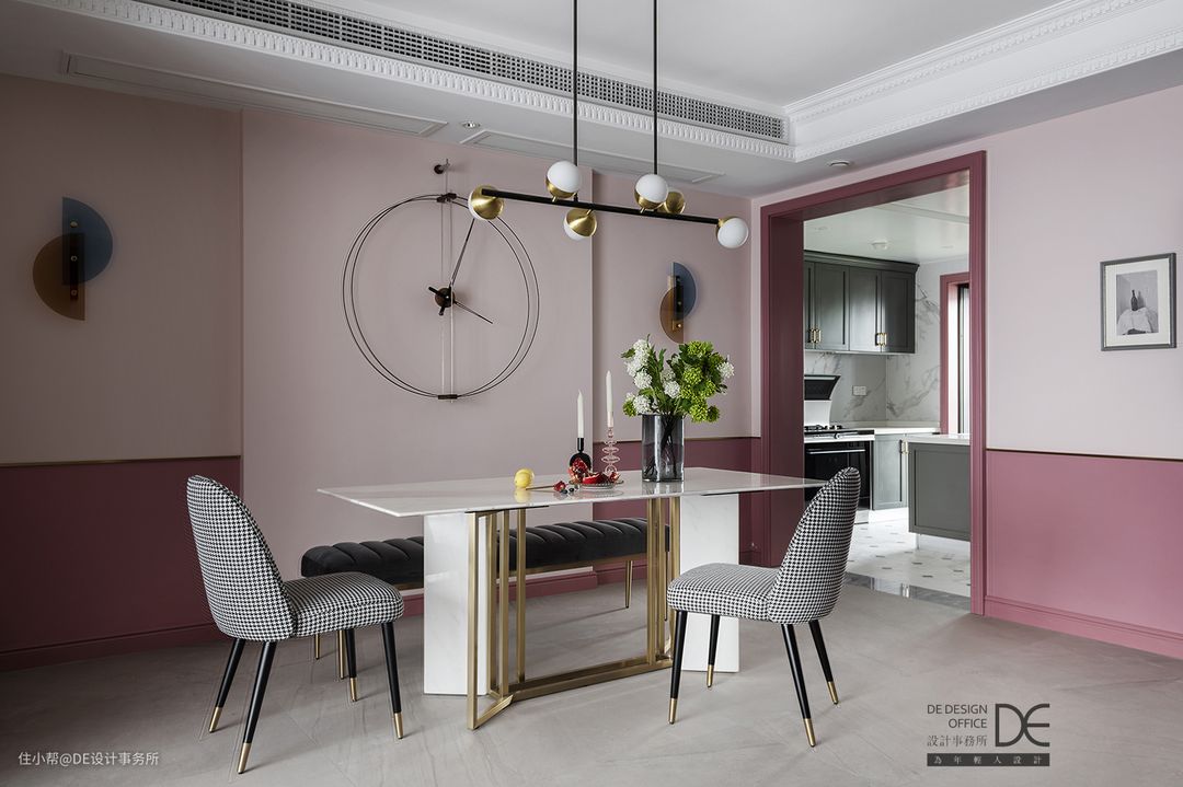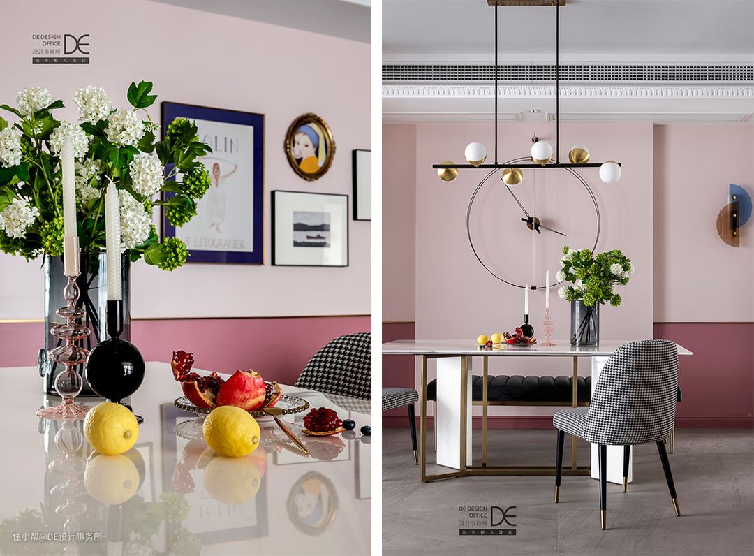 乍一看,整个客餐厅都充盈着粉色,但静观一会儿会发现,这个空间绝不止「粉色」这么简单!