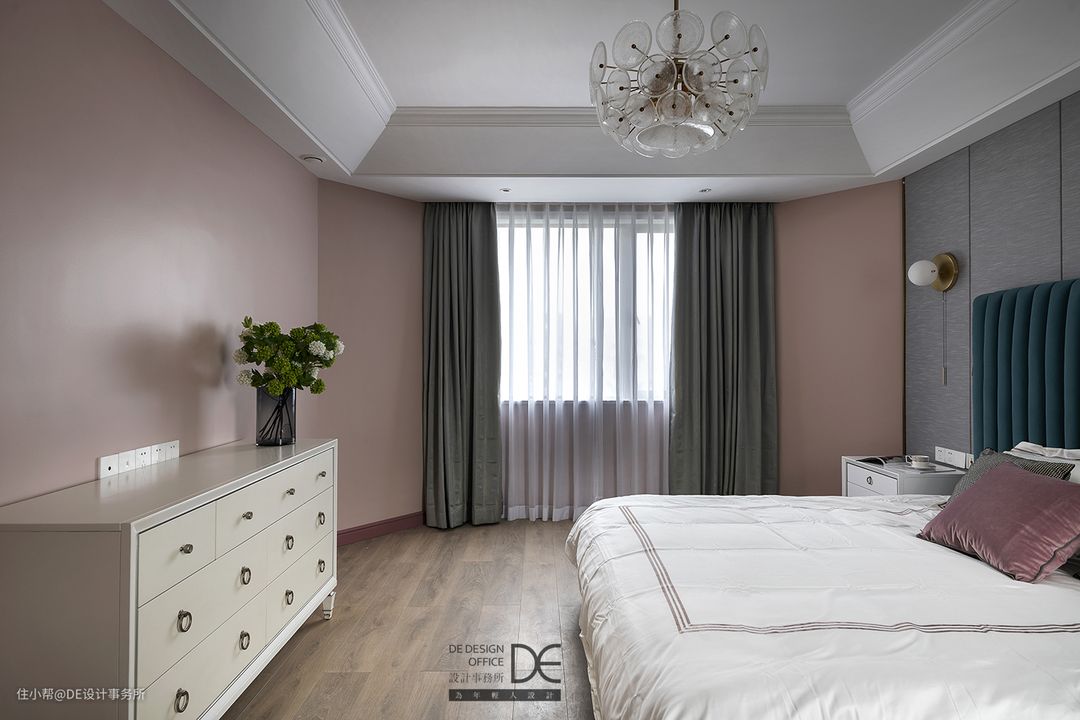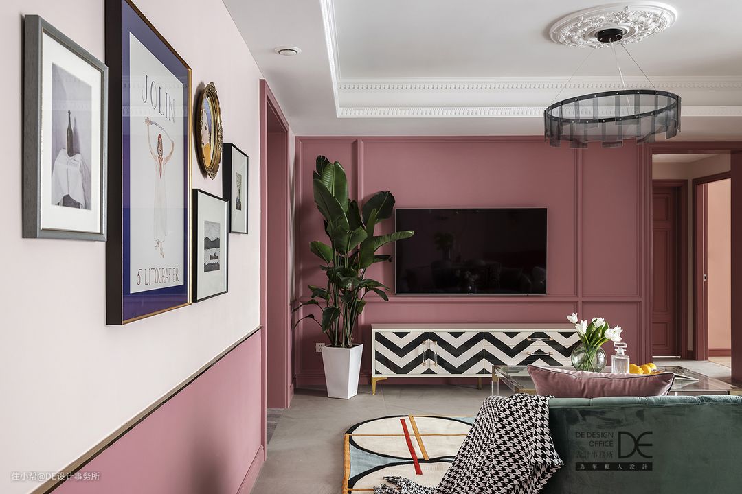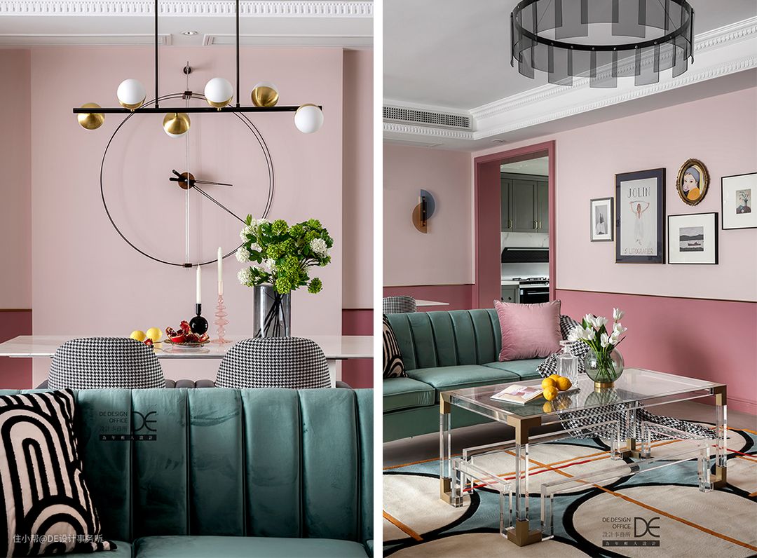 不同层次的柔玫瑰粉在不同的区域有序跳动,似乎有着某种节奏,晶莹剔透的茶几和透明质感的吊灯相呼应,整个空间层次分明,搭配蓝色沙发给人视觉上的跳跃感,让粉色不再单调。