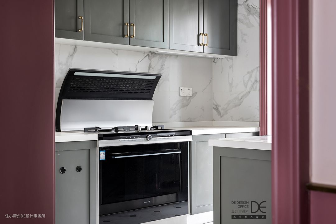 半开放式厨房铺满爵士白花纹墙砖,提升空间质感。集成灶、蒸箱,以及岛台上的洗碗机水槽等,帮助业主解放双手,享受生活。
