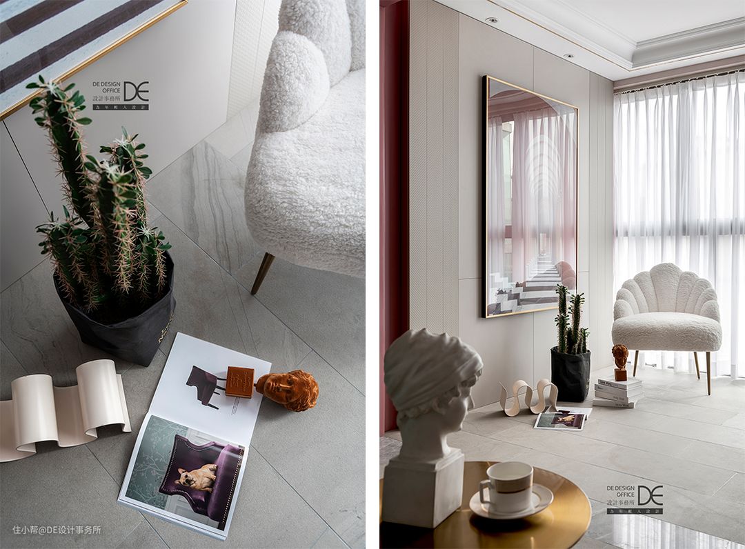 墙面金色不锈钢线条让粉嫩的空间多了几分硬朗,花艺也为这里增添了不少生机,彰显出主人精致的生活品质。甜甜气息充满了整个空间,仿佛一杯Pink Mojito,赋予空间不一样的浪漫。