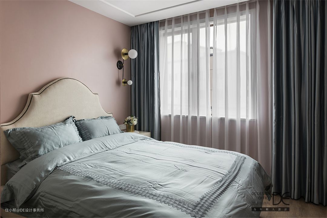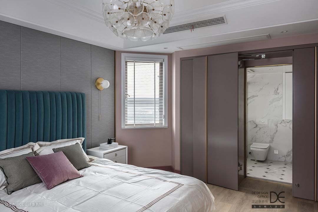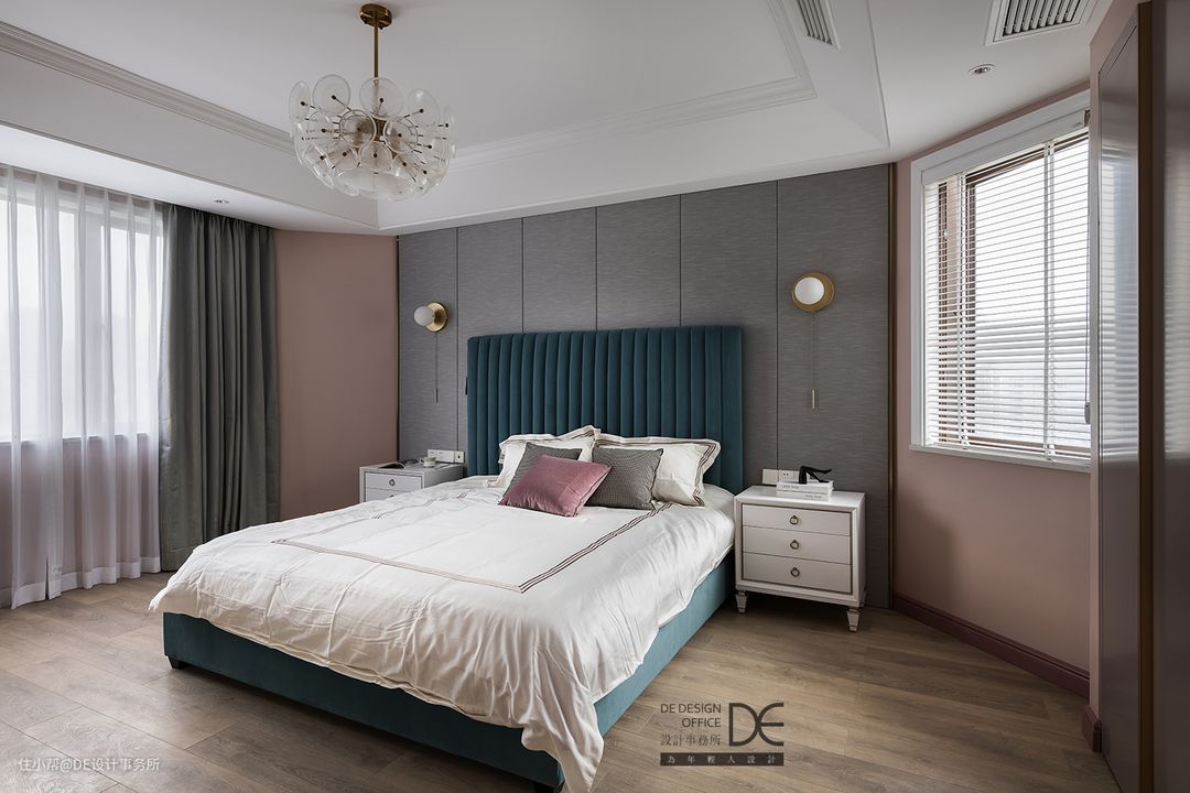 主卧床头背景墙采用布艺硬包和蓝色的软包相结合,让主卧空间显得大气,布艺的材质让空间更加柔软。黄铜色的收口条和粉色乳胶漆墙面和整个空间的色调相呼应。