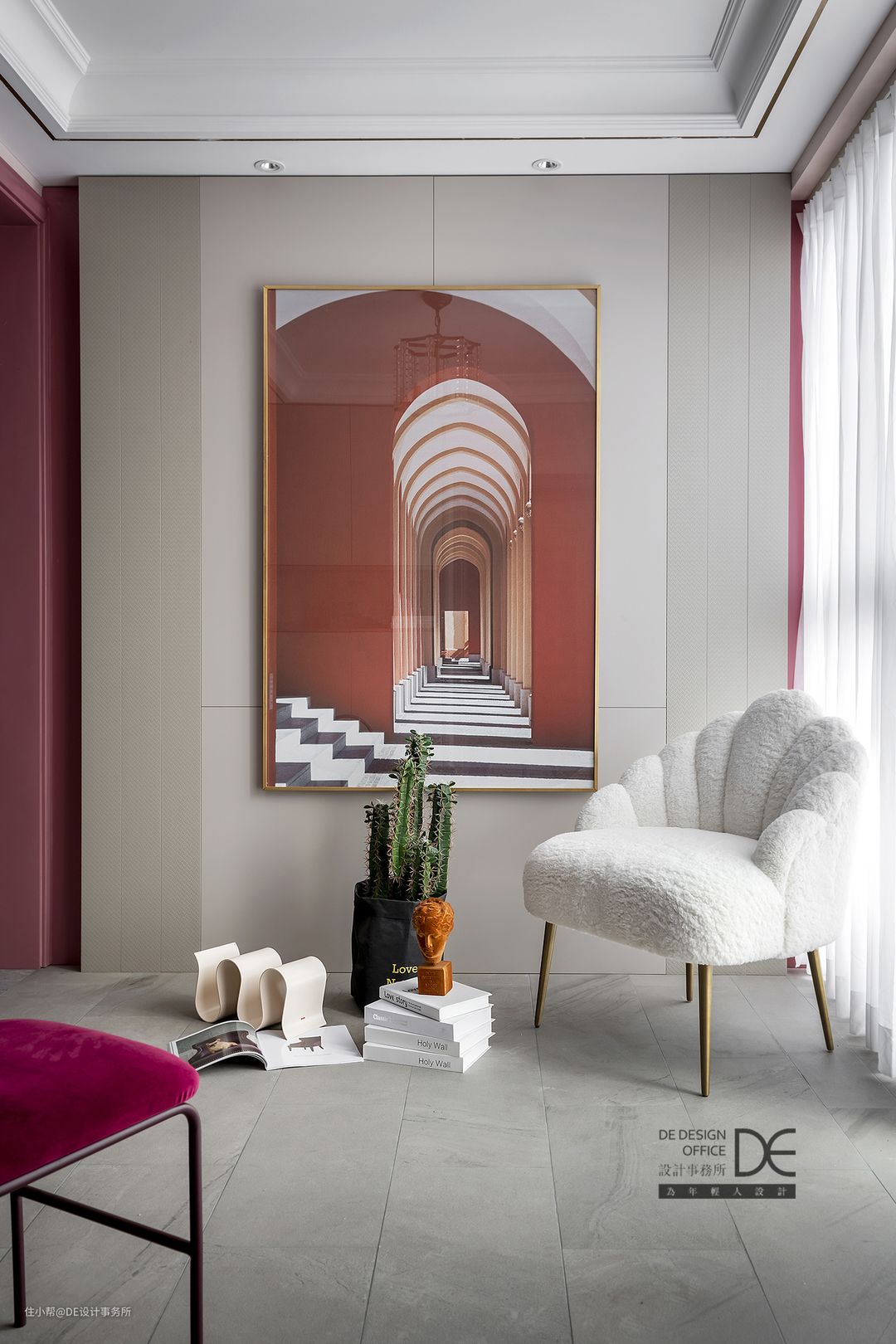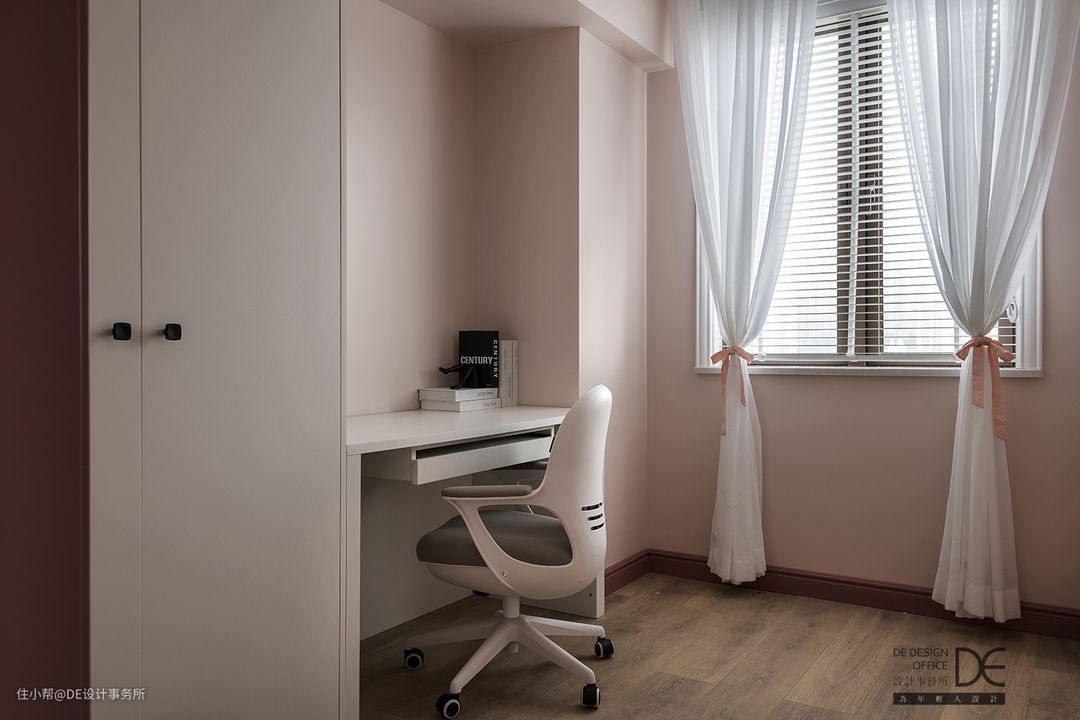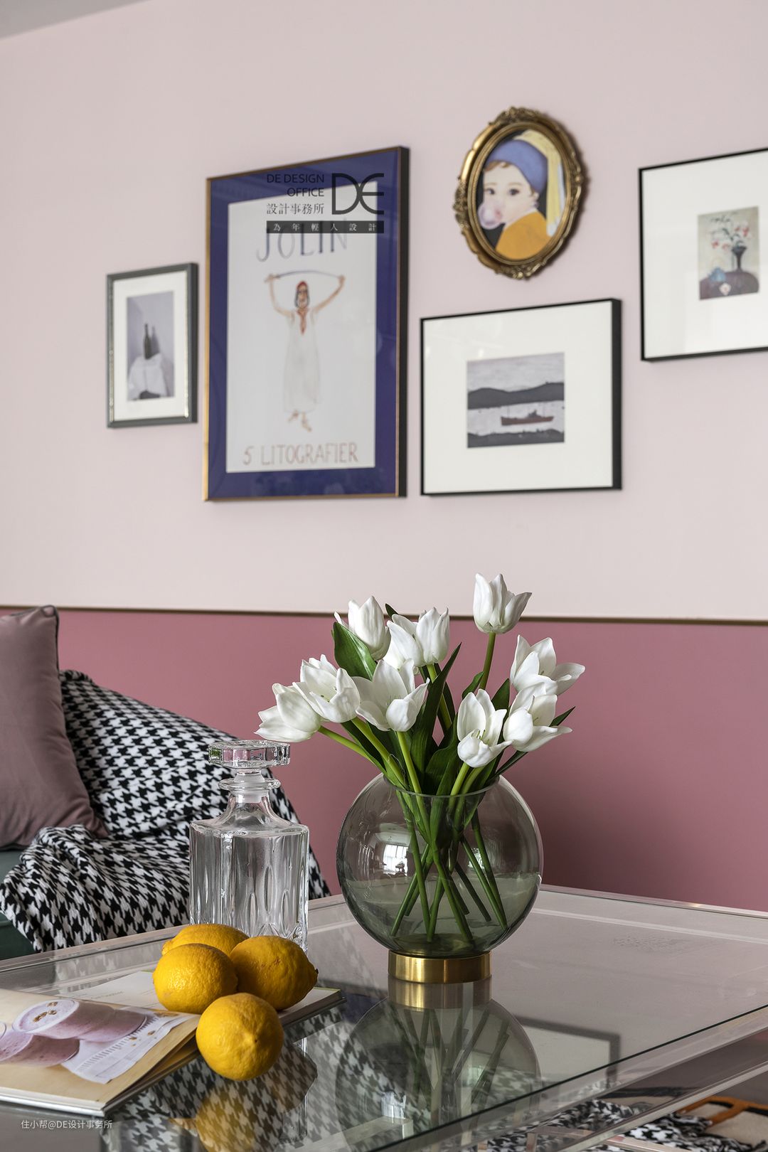 墙面金色不锈钢线条让粉嫩的空间多了几分硬朗,花艺也为这里增添了不少生机,彰显出主人精致的生活品质。甜甜气息充满了整个空间,仿佛一杯Pink Mojito,赋予空间不一样的浪漫。