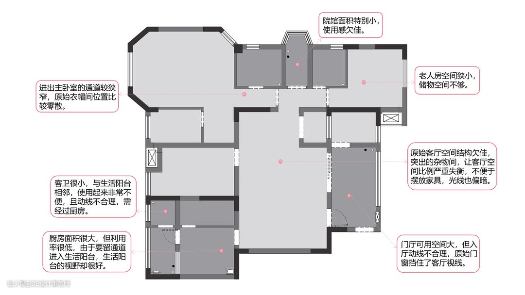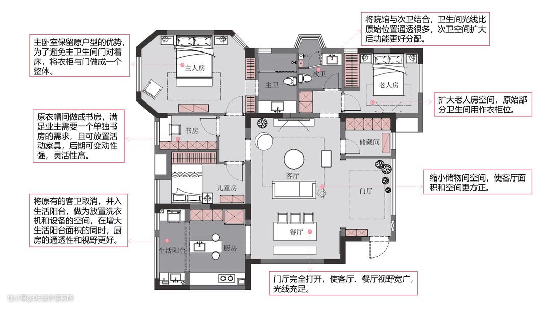 • 原始户型窗户虽多,但因墙体结构原因,室内光线不够充足。在设计过程中,设计师将原始空间中多余的转角、墙体拆除,增加整个空间的采光。 • 门厅和客厅打通,拆除多余墙体,空间视线更加开阔,整体性加强。 • 设计师将院馆改造成次卫淋浴间,扩大了老人房的空间面积。 • 原客卫纳入生活阳台,生活阳台的使用面积扩大,功能也得到更好发挥。 • 为了满足男主人独立书房的需求,主卧衣帽间的功能分配上,设计师处理得比较灵活:将原始衣帽间改造成书房,衣柜连着主卫生间门一起定制,后期如果需要增加衣柜储藏,可以再添置活动衣柜。 • 考虑到空间里居住的是三代人,且有未出生的宝宝,储物需求非常大。设计师充分利用过道进行储物设置,还单独设置了一个活动的储物间,储物需求得以解决。