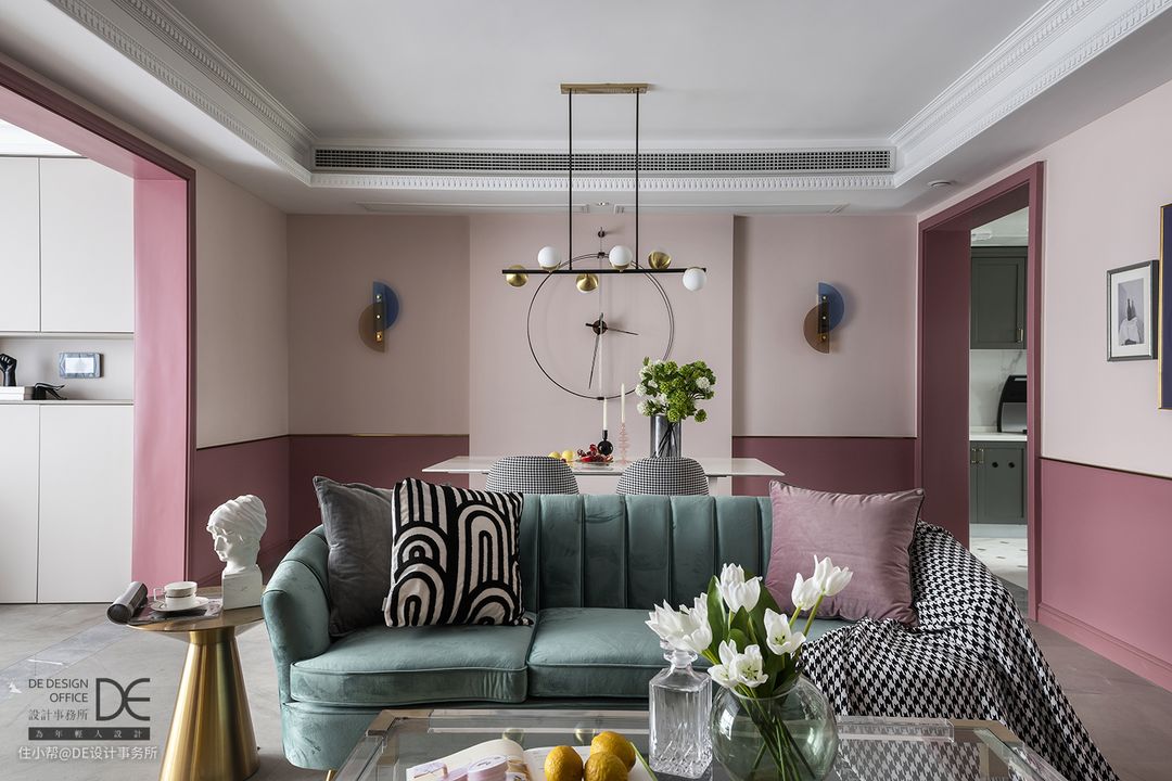 不同层次的柔玫瑰粉在不同的区域有序跳动,似乎有着某种节奏,晶莹剔透的茶几和透明质感的吊灯相呼应,整个空间层次分明,搭配蓝色沙发给人视觉上的跳跃感,让粉色不再单调。