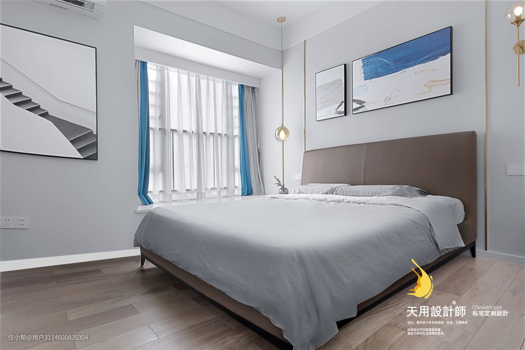 主卧以挂画的元素为参考来布置。大面积的白灰木色作为基调,使其成为让人放松的休憩空间;轻奢简约的线条和灯具,点缀其中的蓝色窗帘,让主卧从单调乏味中跳出来,很好地展现业主的有趣的个性与生活品位。