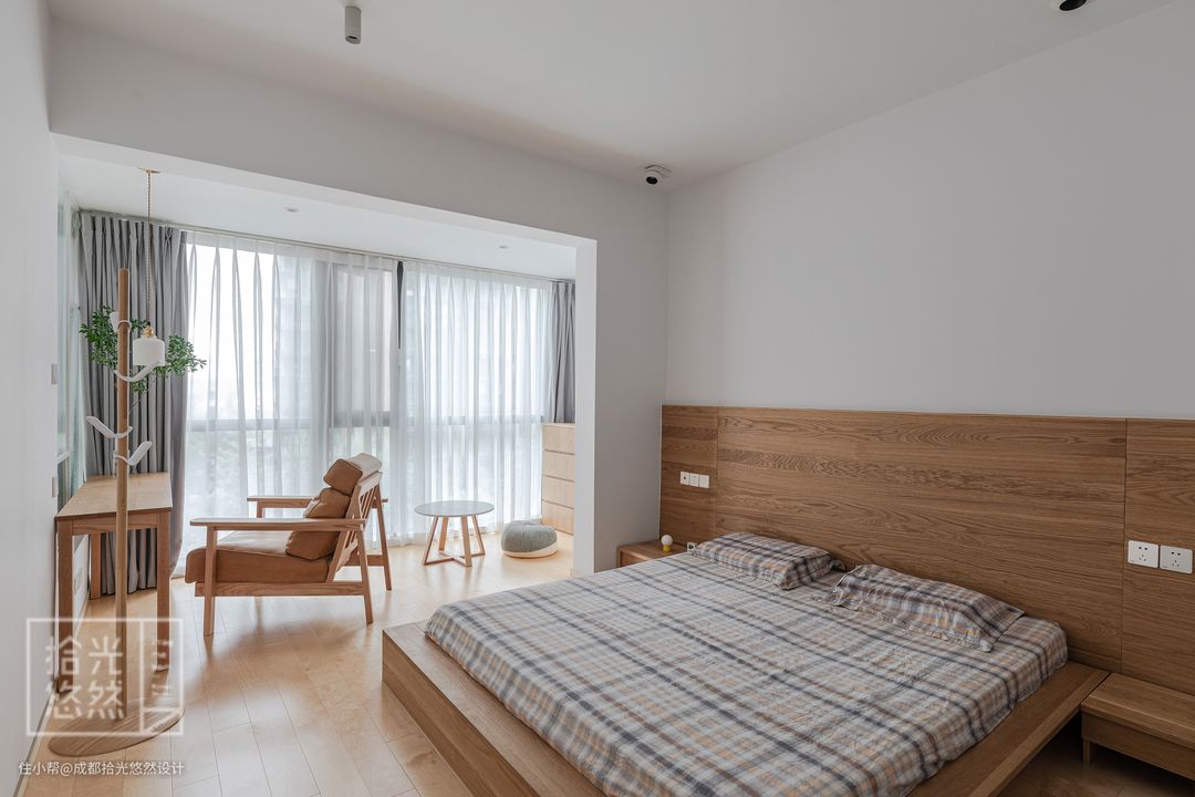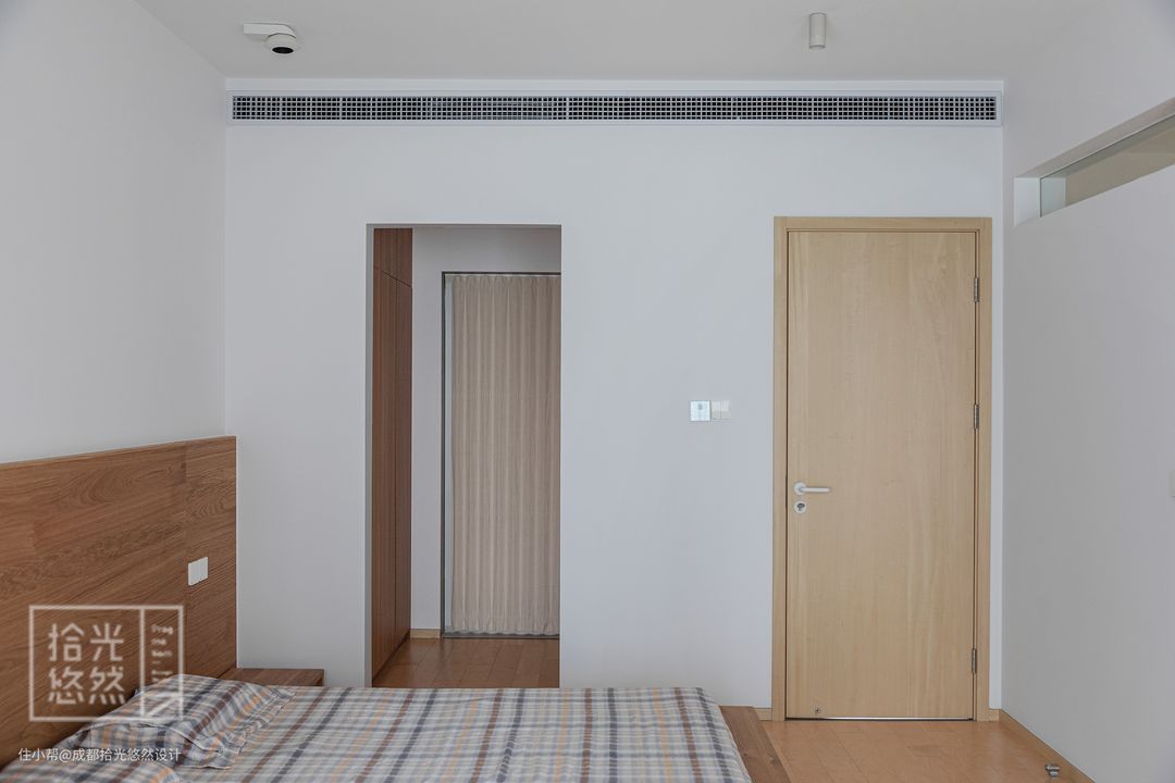 主卧的床设计的相对较矮,更像榻榻米的感觉。 阳台与客厅打通,让空间显得更宽敞明亮,整个主卧是无主灯设计,无吊顶设计。我们将中央空调的出风口放在了墙体上面,左边的门洞里面是步入式衣帽间,与卫生间相互连接的门洞,采用日本的折叠门,性价比高,不占用空间且防水耐用。