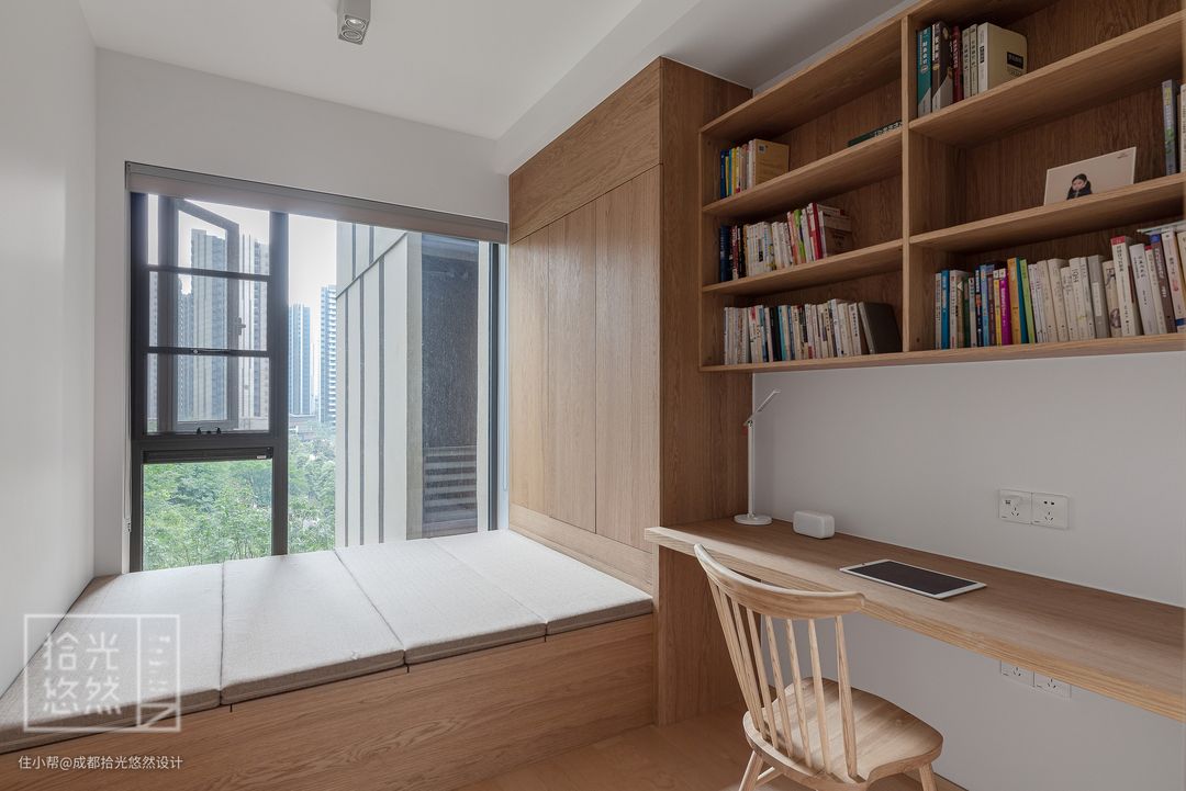 这个房间可以临时睡觉,因为不常住人,所以我们把空调考虑在了柜子里,需要的时候,把柜子门撑开就可以了,这个房间也是屋主办公的地方。