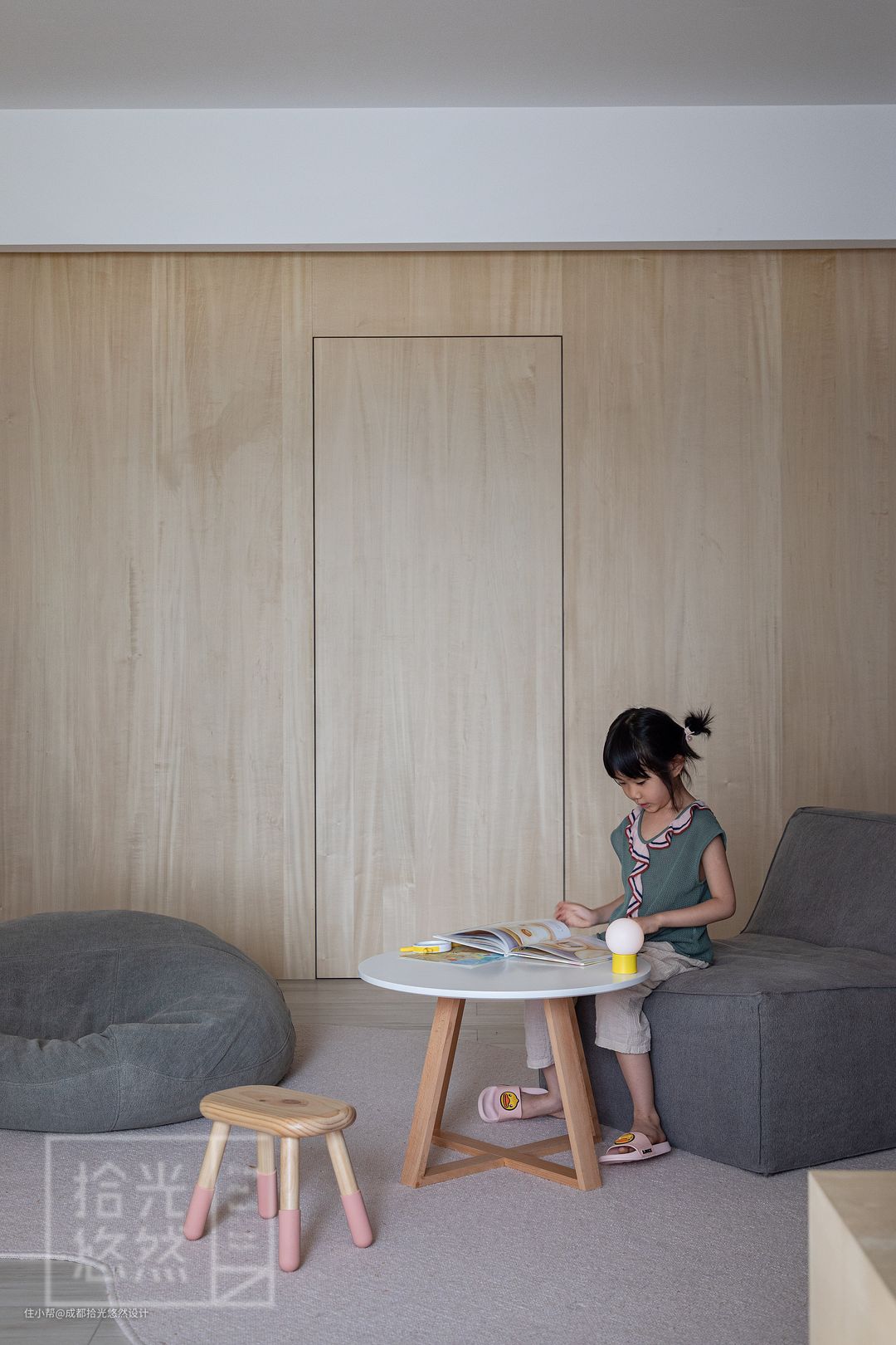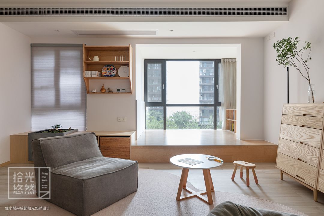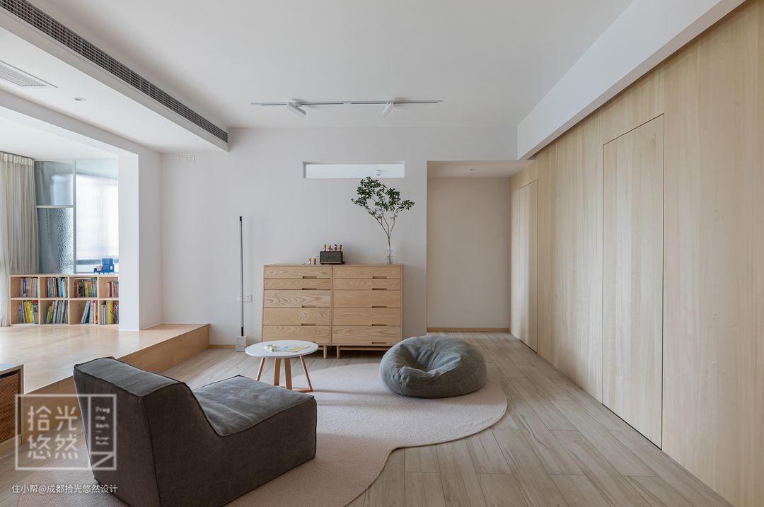 客厅,我们更注重交互性,所以取消掉了传统的沙发设计,通过阳台的融合,人多时可以在榻榻米边缘放垫子增加临时座位,鼓励大家更健康与去传统化的客厅设计方式去看电视待客,更加推崇家人们一起聊天,游戏,娱乐,运动,所以在他家客厅是一个多半变的空间。