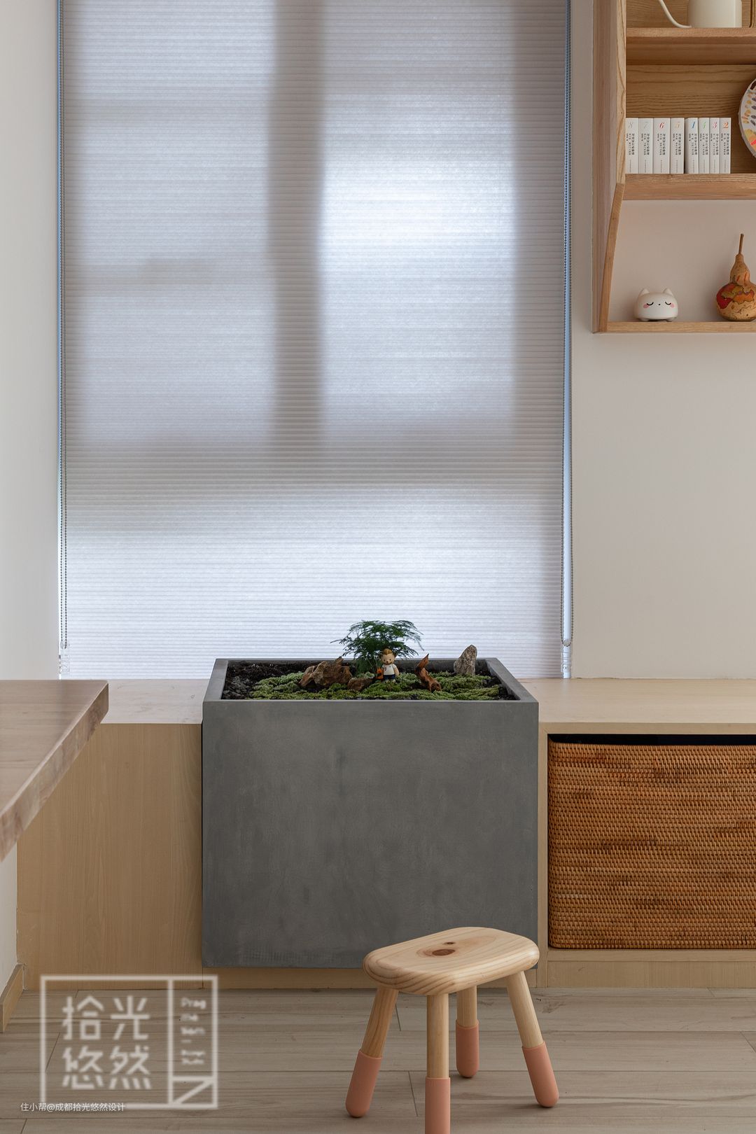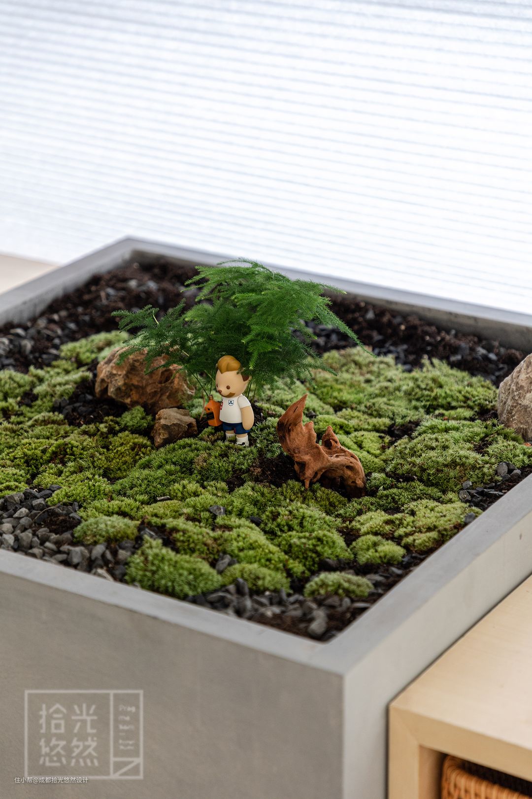 我们在客厅与餐厅之间设置了收纳矮柜,定制了一块水泥盆,铺上了苔藓与小竹子。
