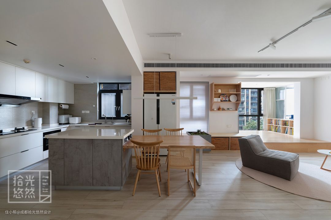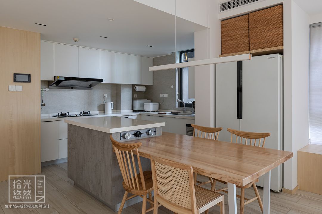厨房做的开放式,与岛台之间形成了黄金三角动线,洗、切、炒,摆盘,走的路不超过5步。 由于屋主对电视的需求度不高,通过去掉电视和电视墙占用的空间,增加了冰箱放置的空间,同时上面考虑了置物的收纳盒,可以把不常用的东西收纳进去,岛台与餐桌结合的方式,除了正常的居家吃饭,也能偶尔容纳更多人临时聚餐。