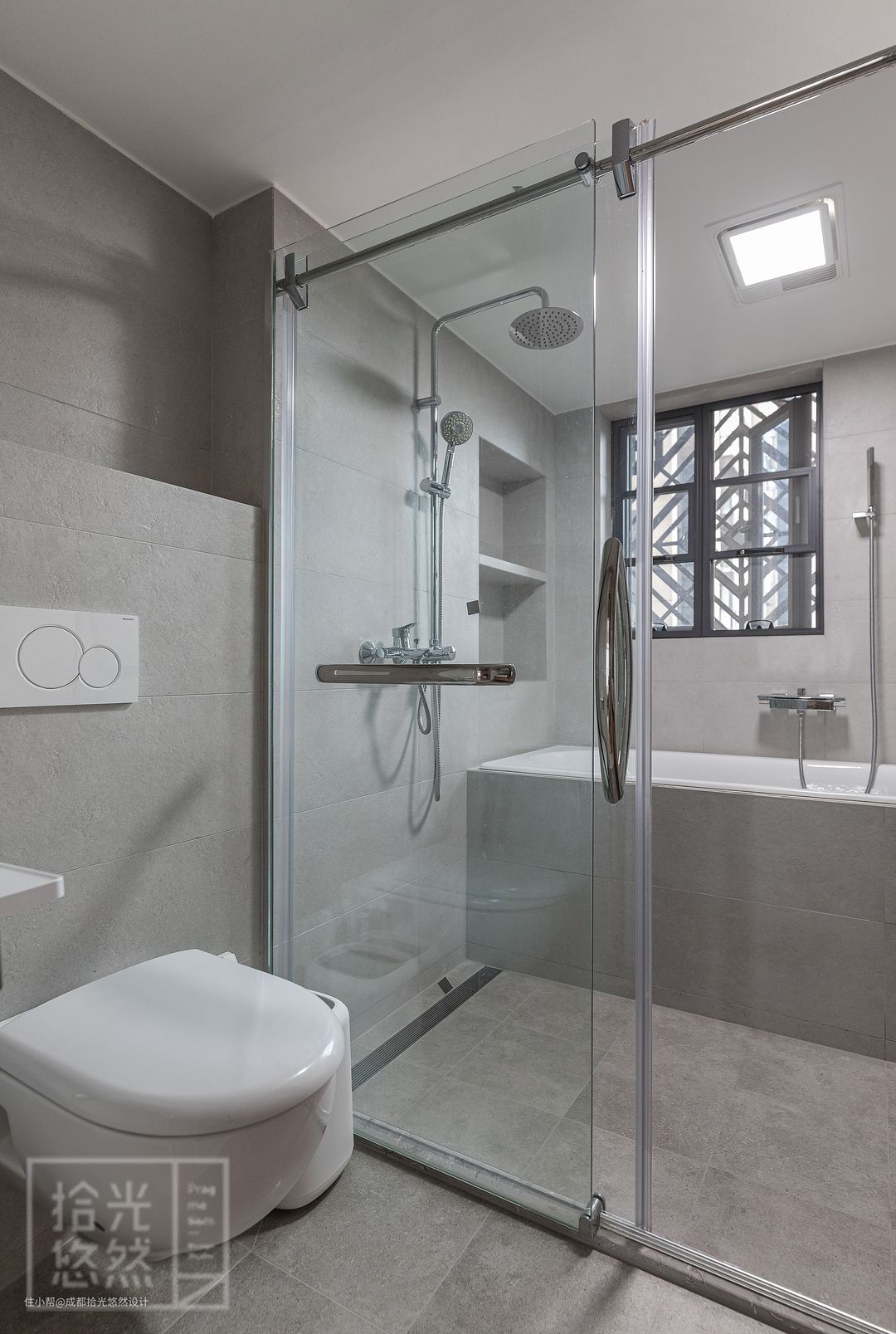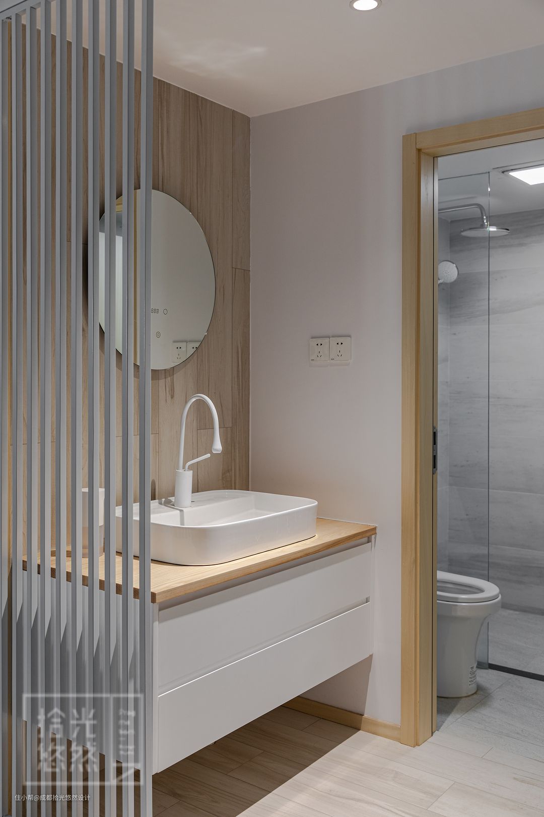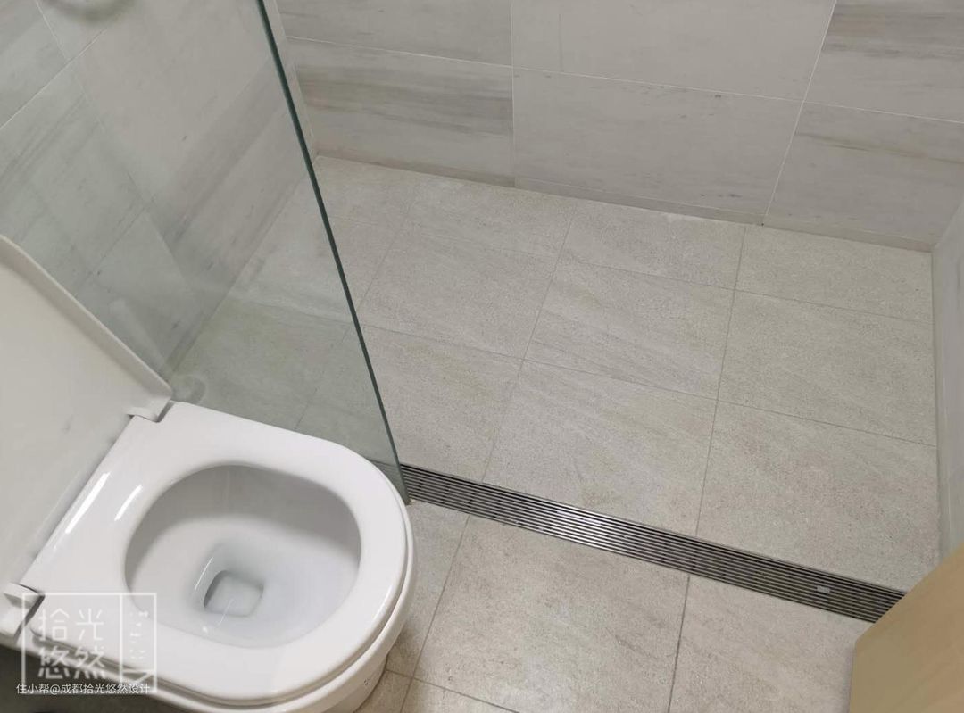 次卫做了干湿分区,因为进门就能看见,所以还是得考虑整体的效果。 次卫空间较小,所以没有做淋浴房,用一块透明玻璃作为隔断,我们在淋浴空间与马桶之间设计了断水槽工艺,保证水不会留出来。
