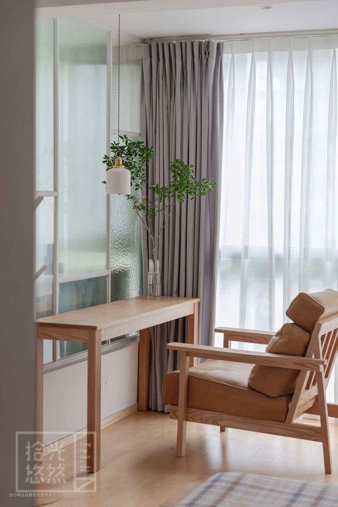 把休闲阳台分成了2块,一块作为客厅的休闲阅读区域,一块作为了主卧的书房与休闲区域,中间通过4种不同的艺术玻璃进行了隔断,透光不透明。