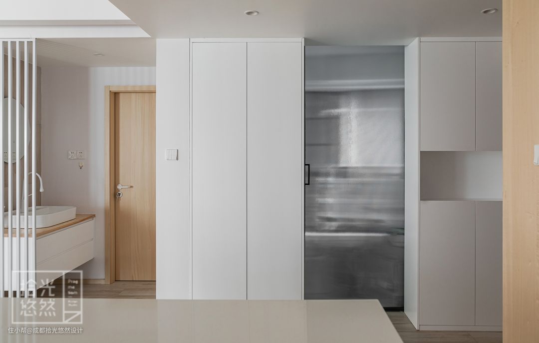 进门右边是烟道,我们通过加厚后,再加上木饰面包裹弱化它的体块感,把橱柜挡在里面。左边是鞋柜,通过中间镂空可以放置包包。鞋柜后面是暗藏式推拉门,玻璃是用的大灯芯,透光不透明,有质感。玻璃门后面就是我们的洗衣房。