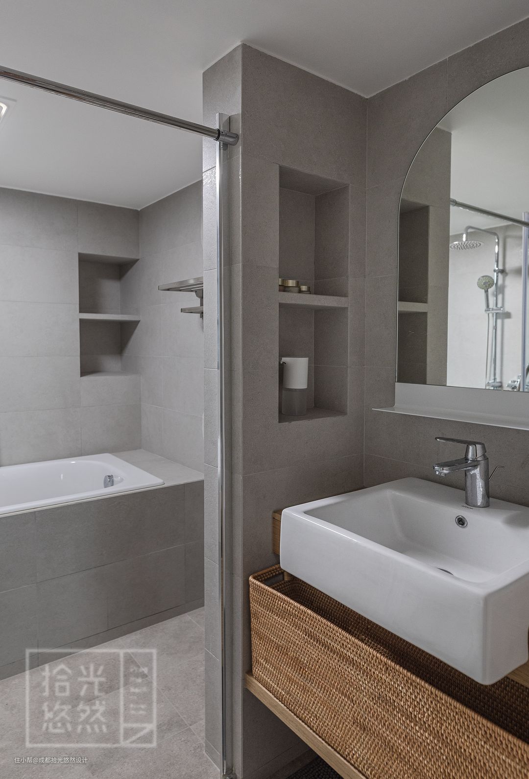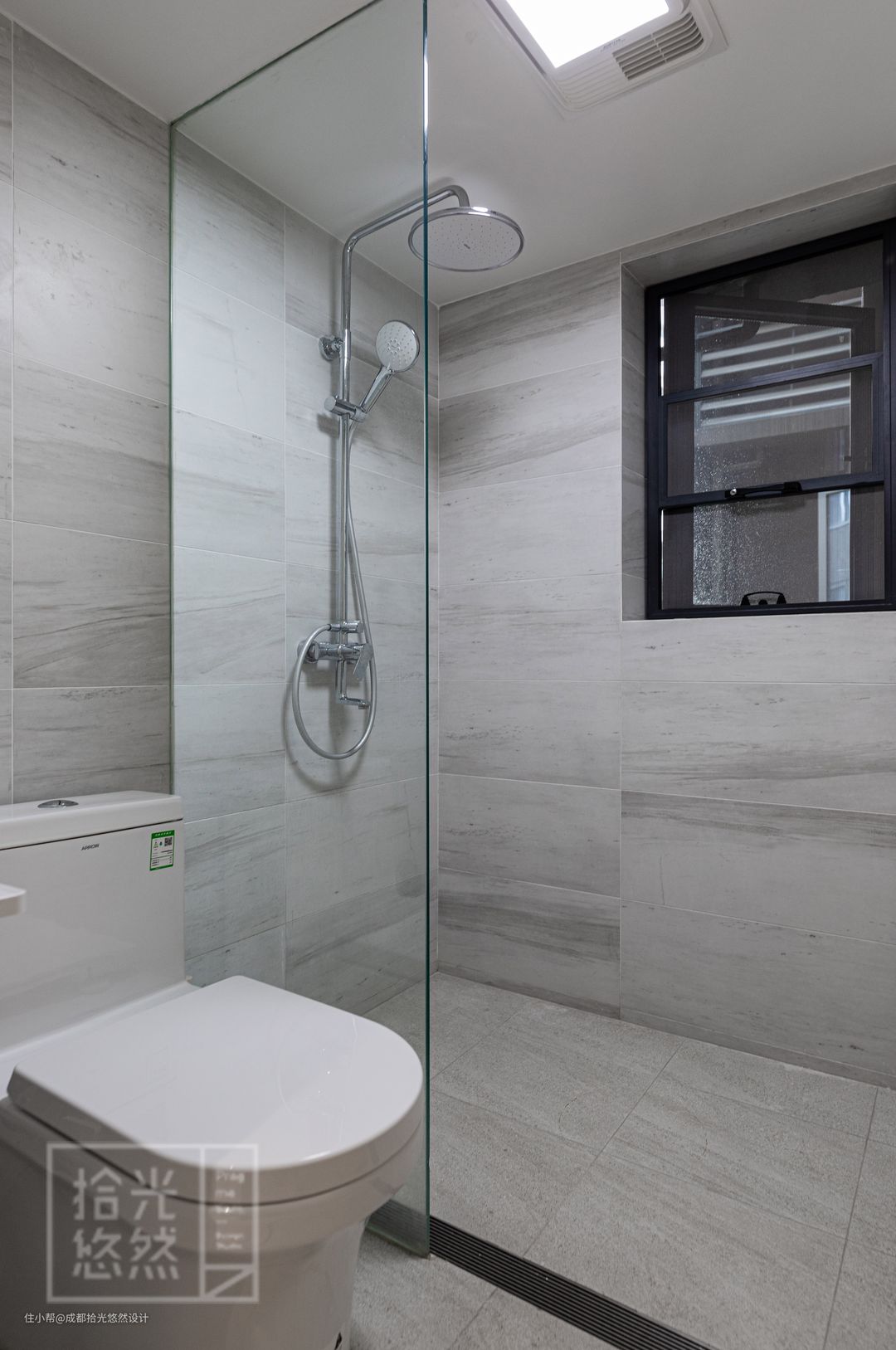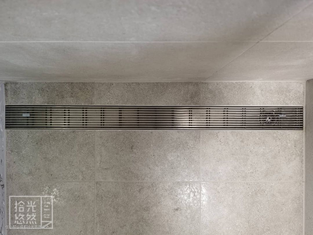 次卫做了干湿分区,因为进门就能看见,所以还是得考虑整体的效果。 次卫空间较小,所以没有做淋浴房,用一块透明玻璃作为隔断,我们在淋浴空间与马桶之间设计了断水槽工艺,保证水不会留出来。