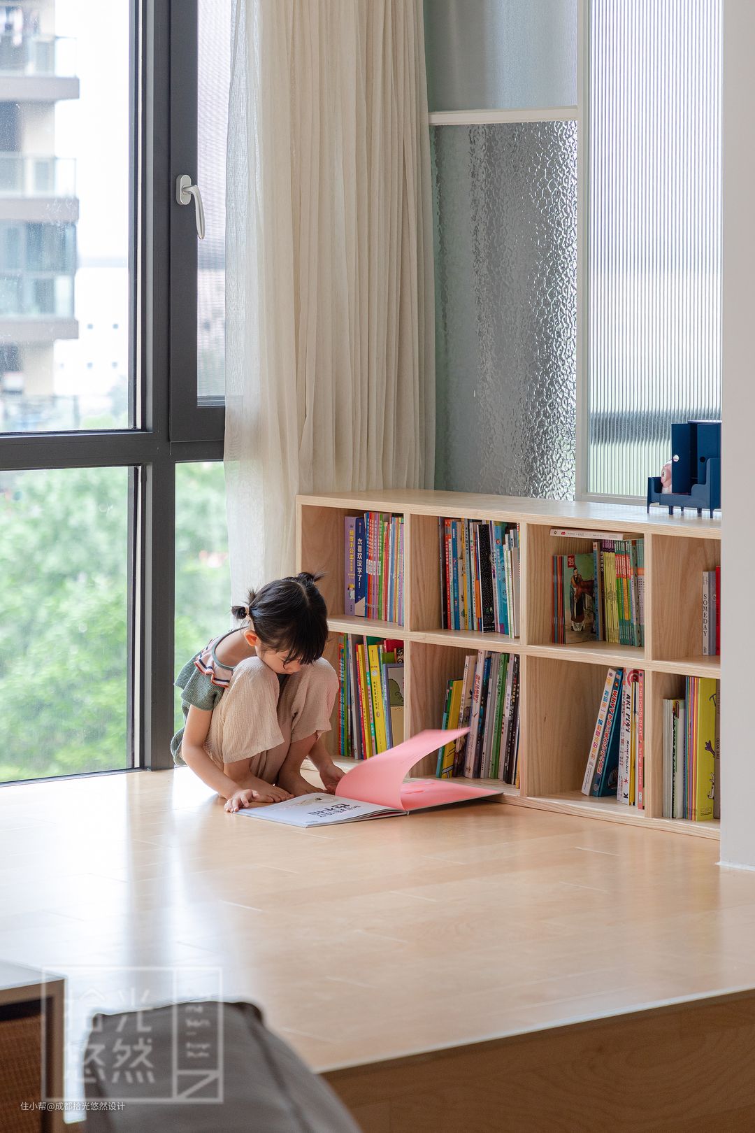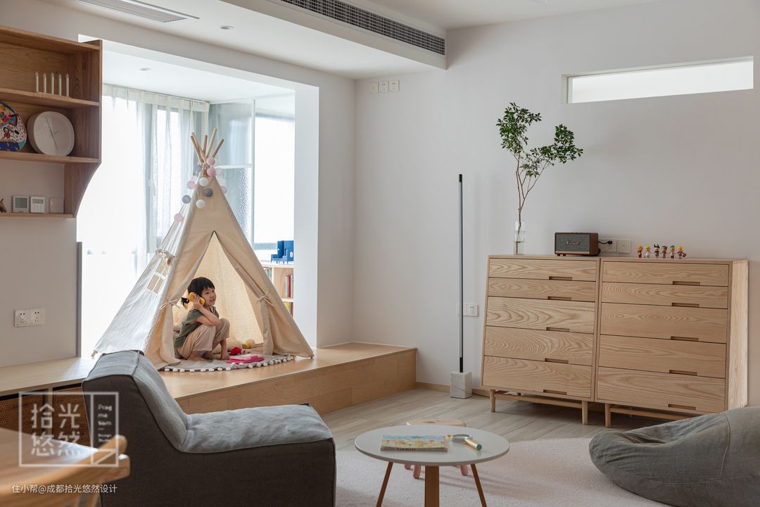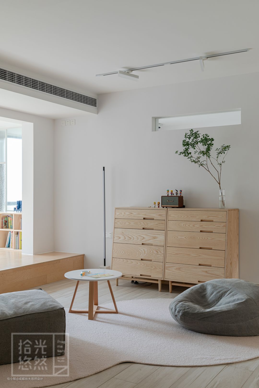 客厅,我们更注重交互性,所以取消掉了传统的沙发设计,通过阳台的融合,人多时可以在榻榻米边缘放垫子增加临时座位,鼓励大家更健康与去传统化的客厅设计方式去看电视待客,更加推崇家人们一起聊天,游戏,娱乐,运动,所以在他家客厅是一个多半变的空间。
