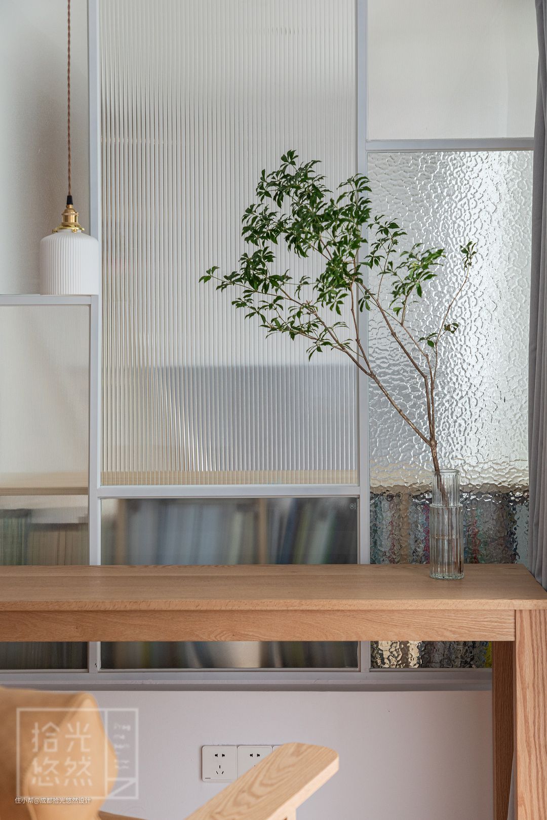 把休闲阳台分成了2块,一块作为客厅的休闲阅读区域,一块作为了主卧的书房与休闲区域,中间通过4种不同的艺术玻璃进行了隔断,透光不透明。