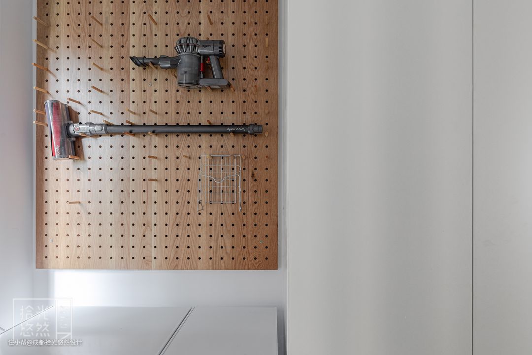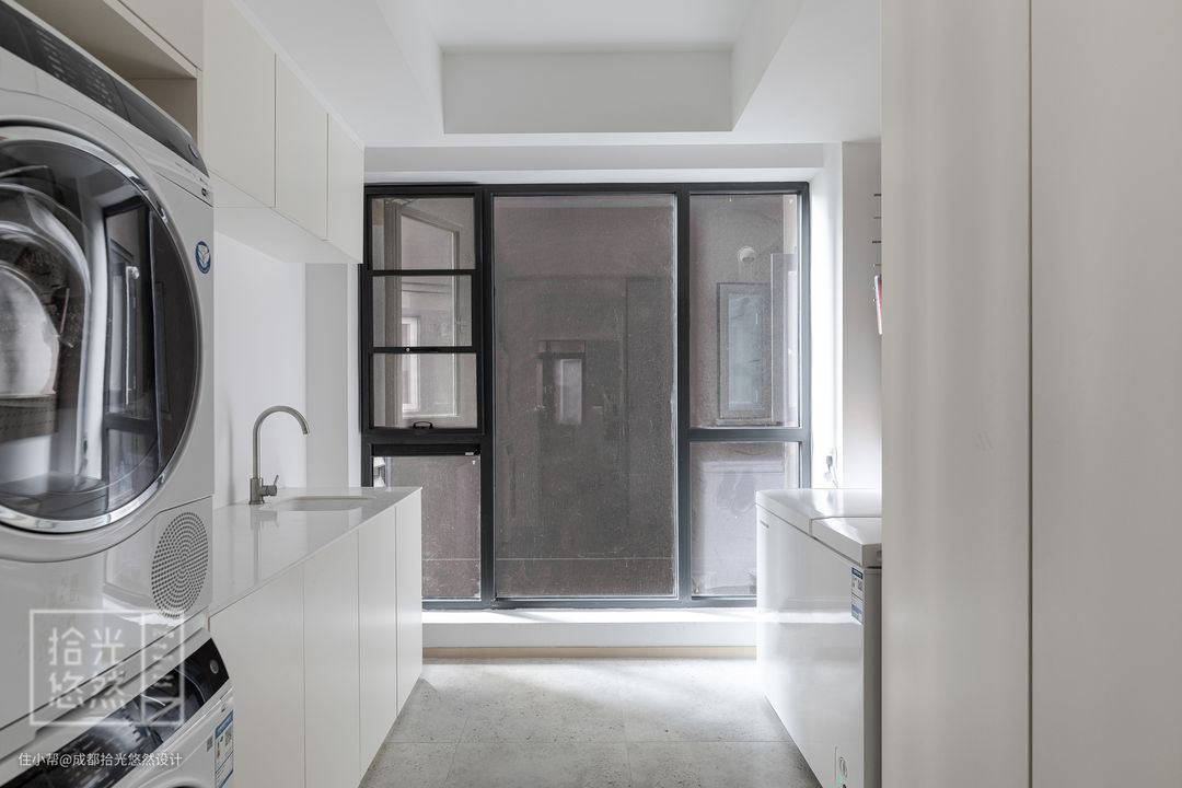 洗衣房里放置了洗衣机,烘干机,洗手池,同时还安排了一门到顶的收纳柜,还一个几百升的冰柜。冰柜上面定制了洞洞板,可以放置很多工具与小东西。