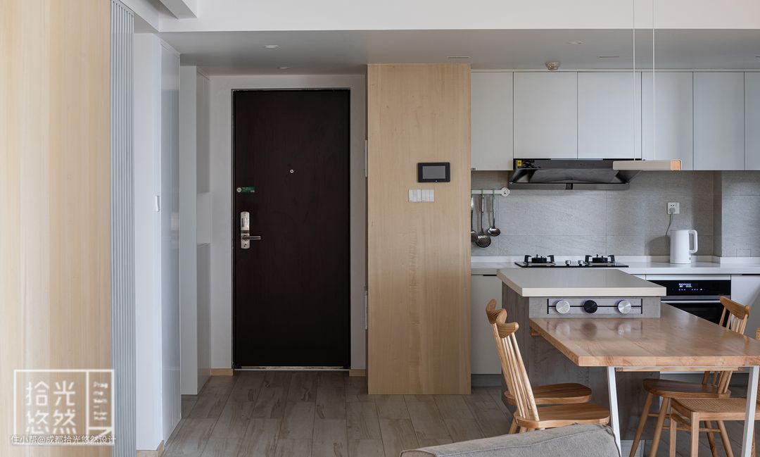 厨房做的开放式,与岛台之间形成了黄金三角动线,洗、切、炒,摆盘,走的路不超过5步。 由于屋主对电视的需求度不高,通过去掉电视和电视墙占用的空间,增加了冰箱放置的空间,同时上面考虑了置物的收纳盒,可以把不常用的东西收纳进去,岛台与餐桌结合的方式,除了正常的居家吃饭,也能偶尔容纳更多人临时聚餐。