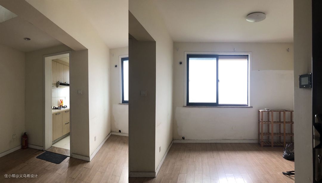 改造前的客厅。 第一次实地站在客厅的时候,就感觉到空间十分局促,客厅厨房相互独立,采光优势也没有发挥出来。当时脑海里第一想法就是要打通这一片区域,让自然光线全部能够照射到每个角落。