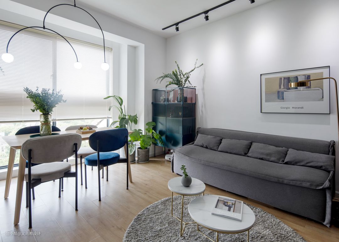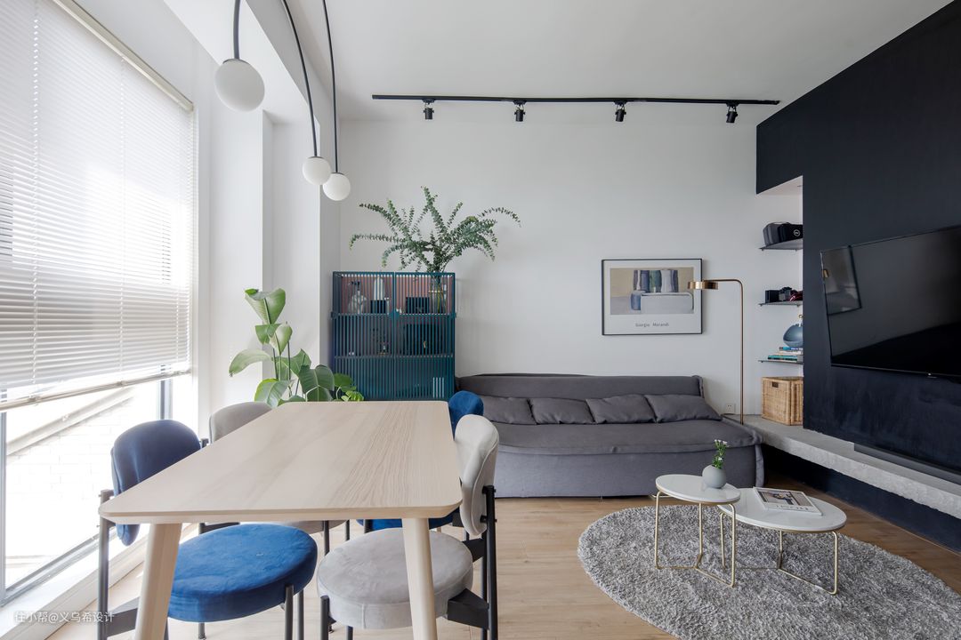 顶上设计的无主灯设计,客厅的照明主要通过射灯,餐厅是吊灯,局部的点照明让家里更有氛围。