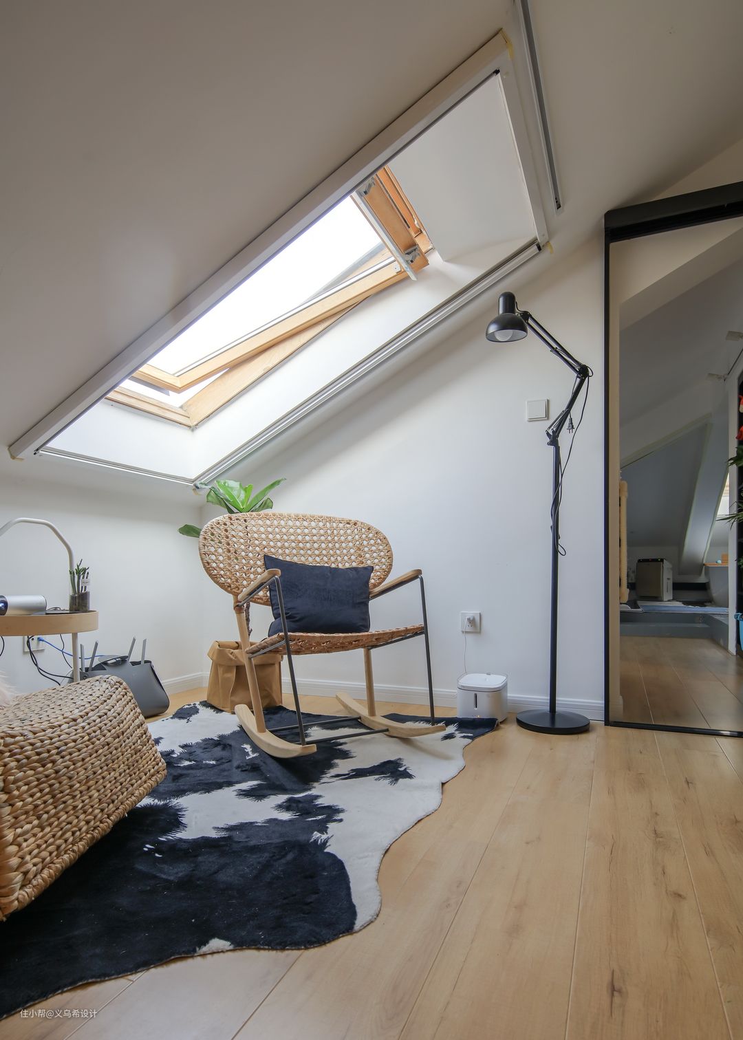走上阁楼,迎面进入的是开放的起居室,天窗采光特别好,在这里放上一把躺椅,坐着看看书,抬头看看外面的天空,思考思考人生,非常惬意。
