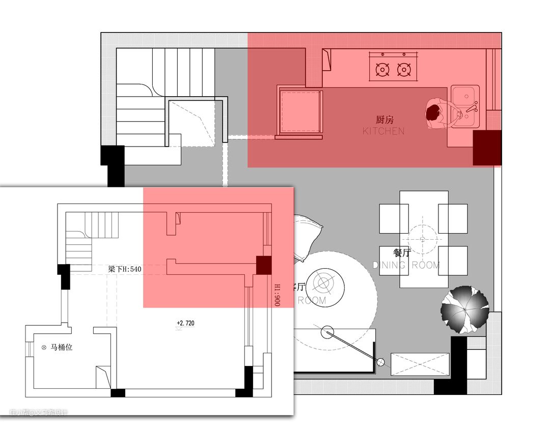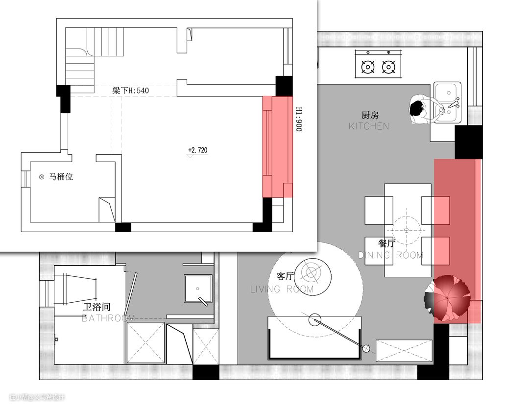 外扩区域示意图,红色位置为一层客厅外的原设备平台。